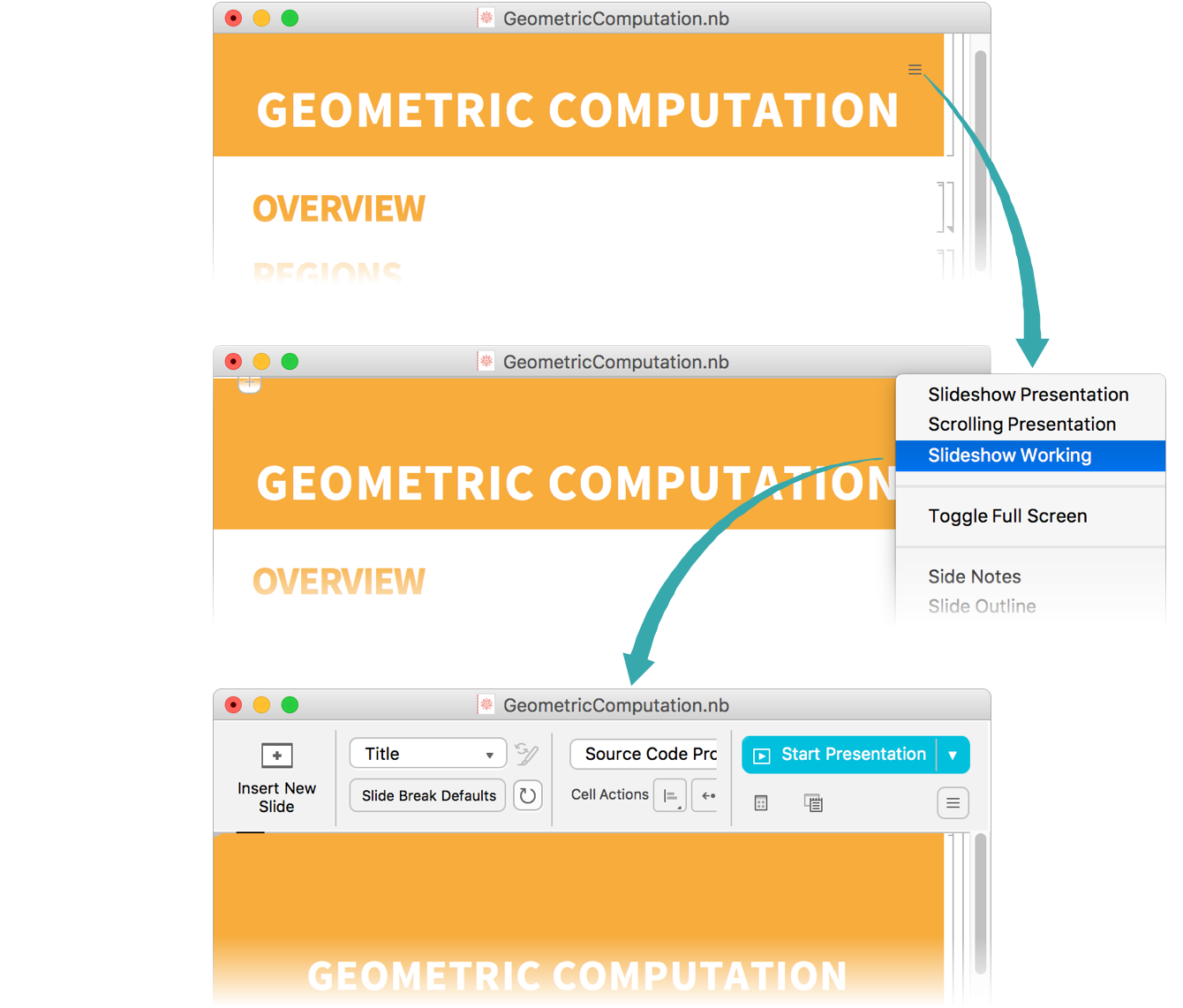 Choose Slideshow Working from the “hamburger” menu in the upper-right corner of the presentation notebook. A toolbar appears at the top of the notebook: