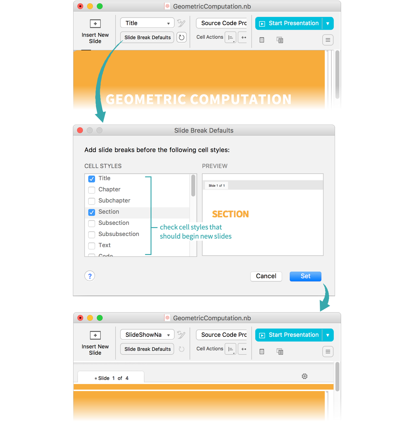 Click Slide Break Defaults in the toolbar and check each cell style that should begin a new slide, typically the Title and Section styles. Slide breaks are added before those cells: