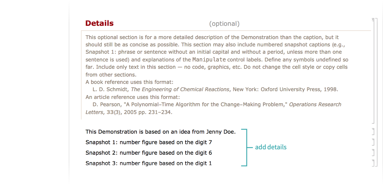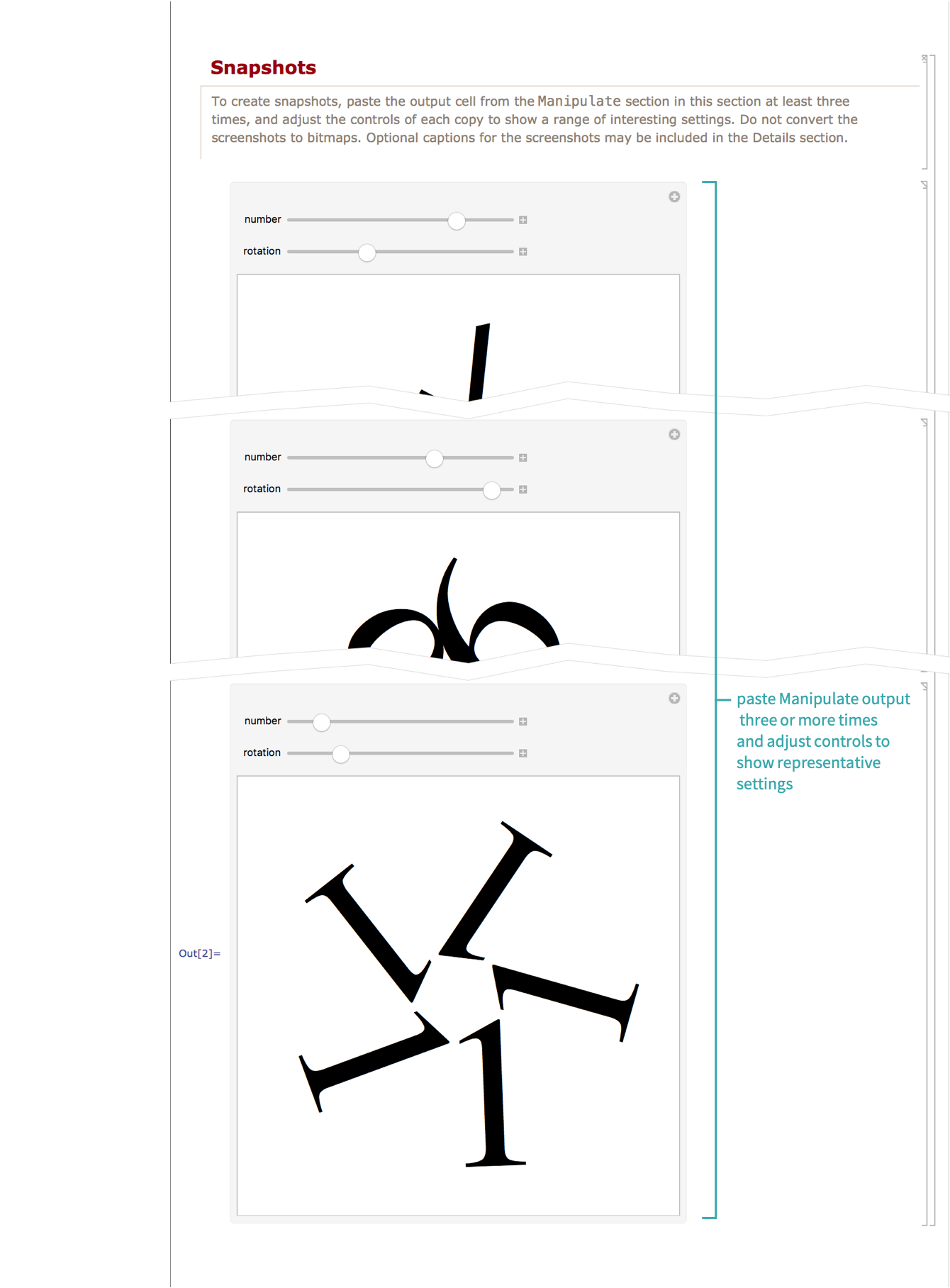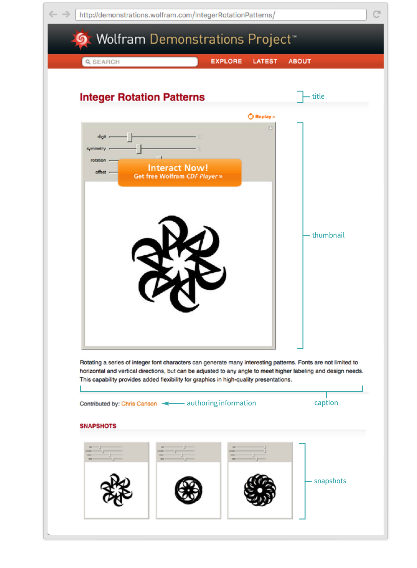 Every Demonstration published in the Wolfram Demonstrations Project has its own webpage that gives an overview of the Demonstration. The authoring notebook for a Demonstration provides sections that you fill in to create these parts of the webpage: