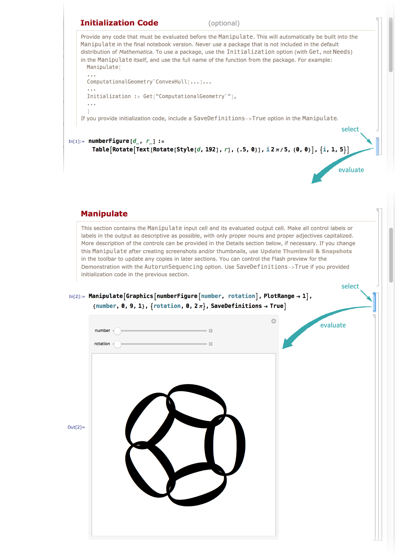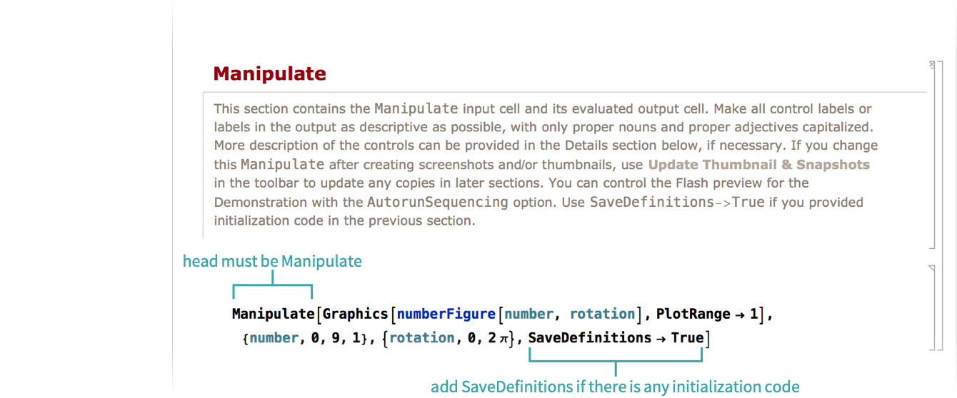 A Demonstration consists of a single Manipulate expression. Replace the template Manipulate expression with your own expression. Include SaveDefinitions->True if you entered any initialization code in the previous section: