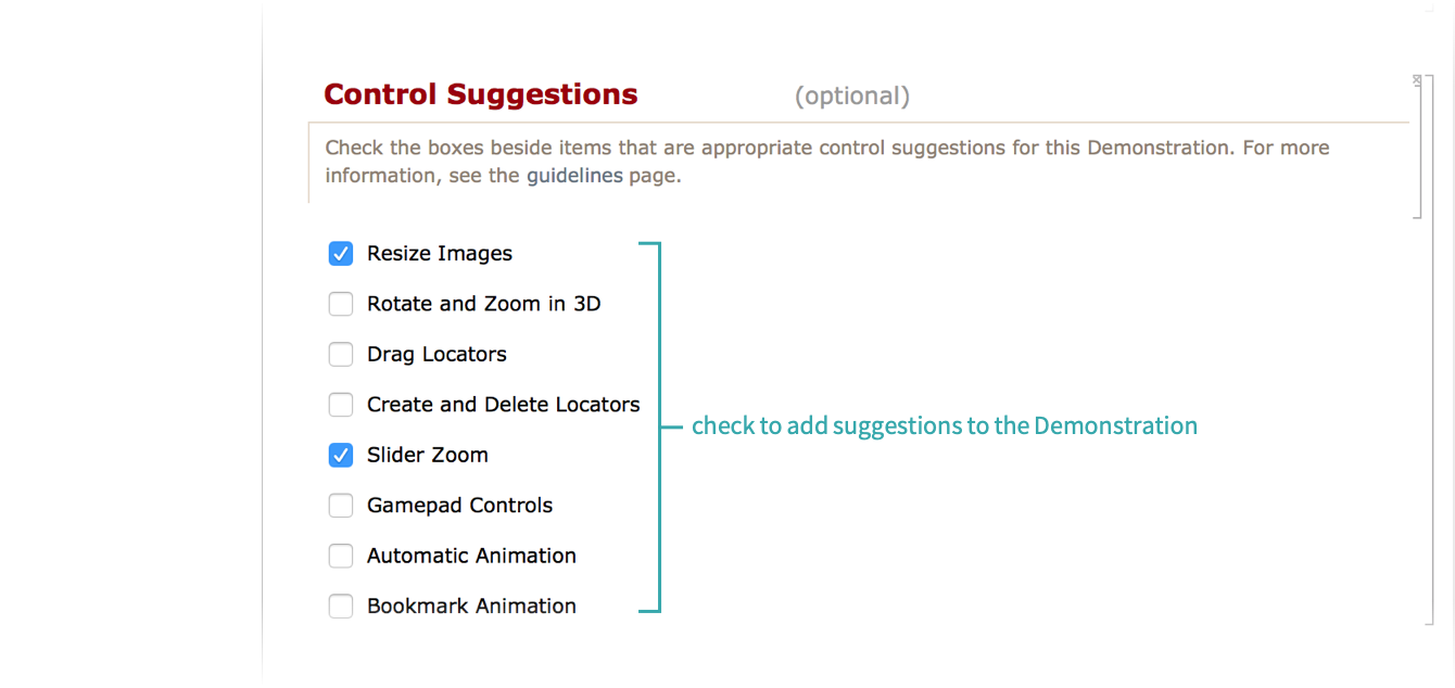 Add suggestions for how to use controls in a Demonstration by checking control suggestions boxes. Hover over an item to see the suggestion text: