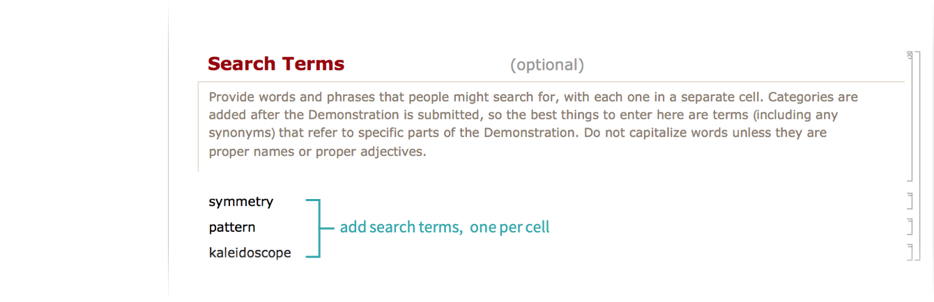 Add optional search terms that will help people find your Demonstration when they search the Demonstrations site: