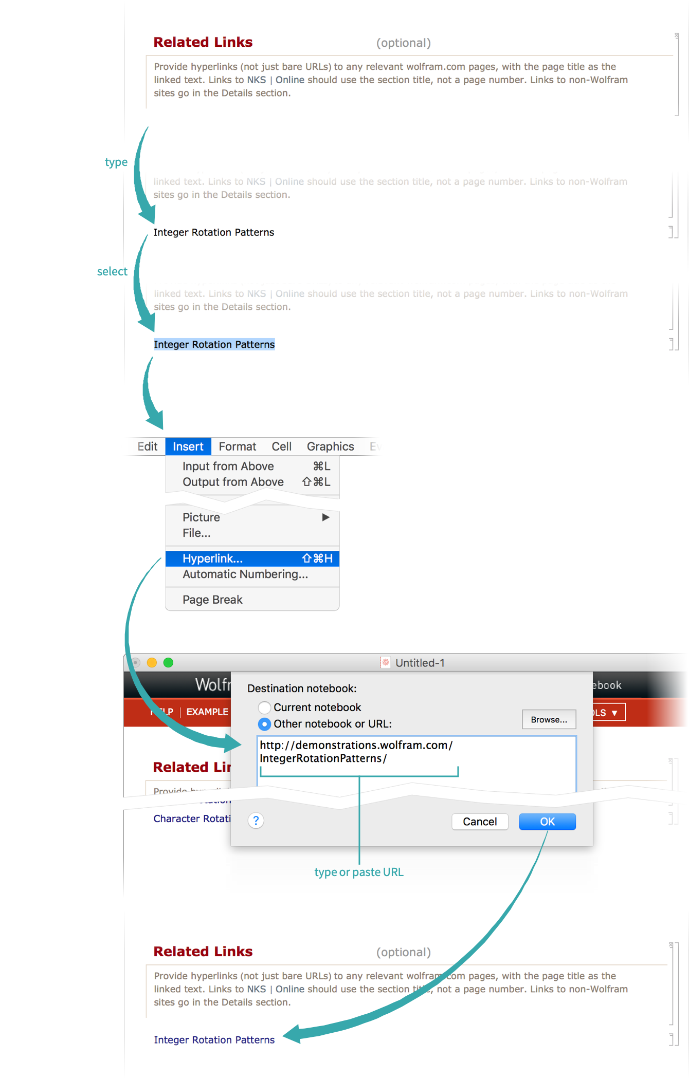 Add optional links to any related Wolfram webpages. Enter links using Insert ▶ Hyperlink (
