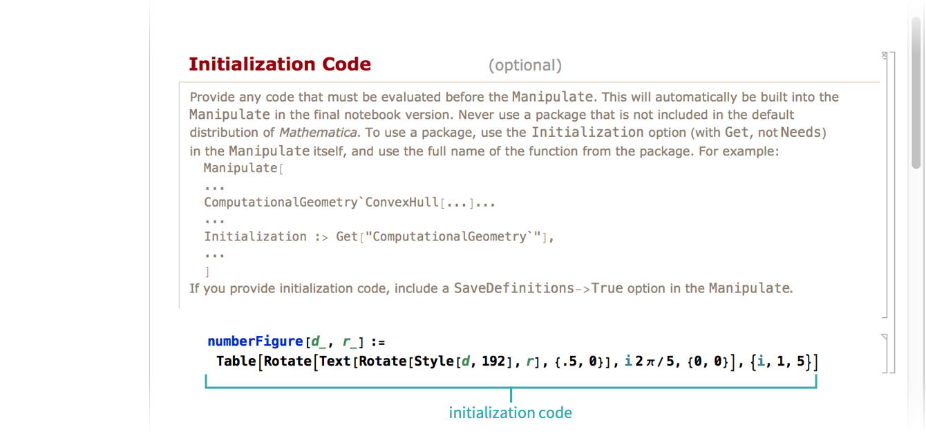 If your Demonstration requires any initialization, enter it in the Initialization Code section. This example Demonstration requires definition of the function numberFigure: