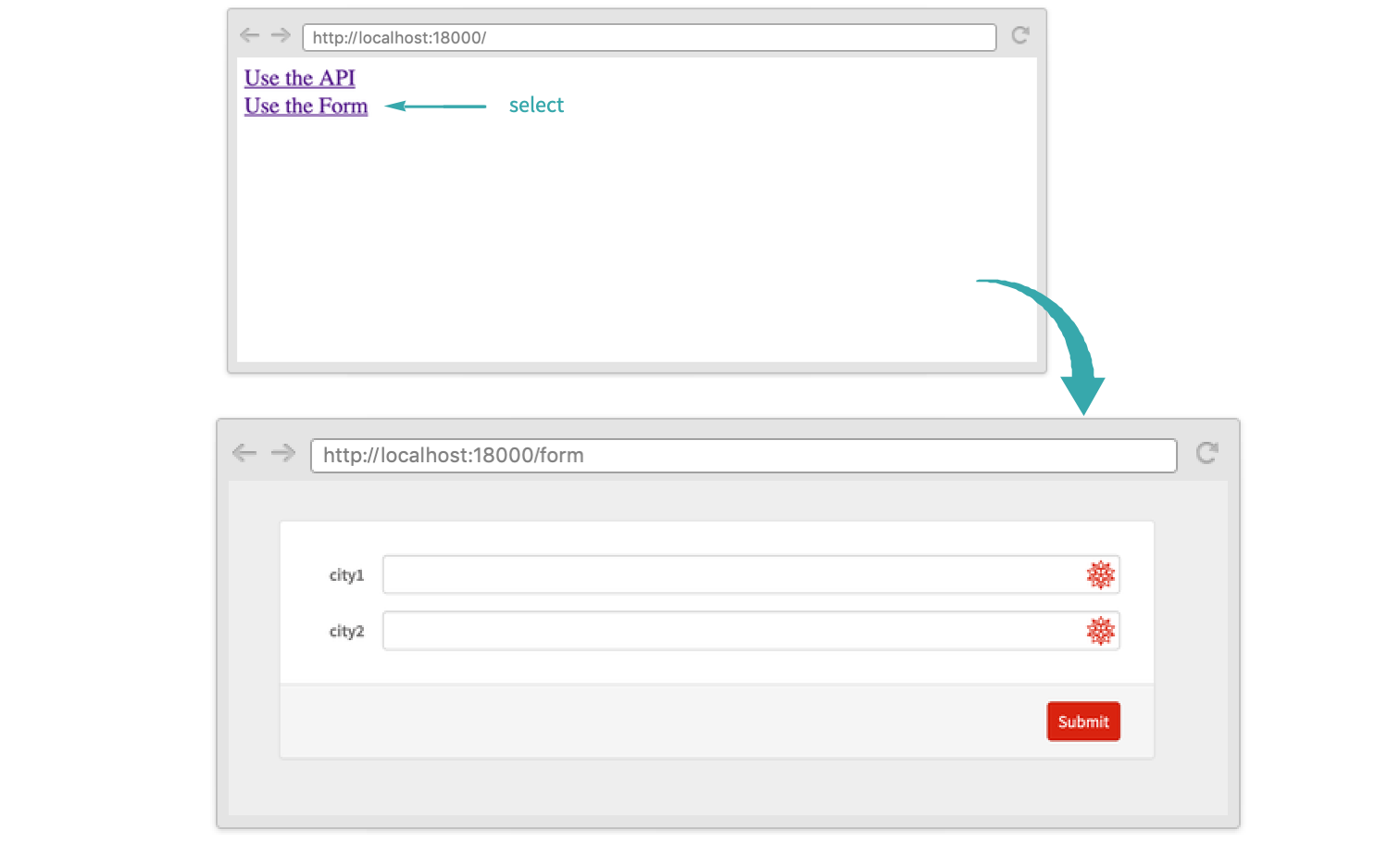 Go to http://localhost:18000 and click the Use the Form hyperlink to be taken to the appropriate endpoint: