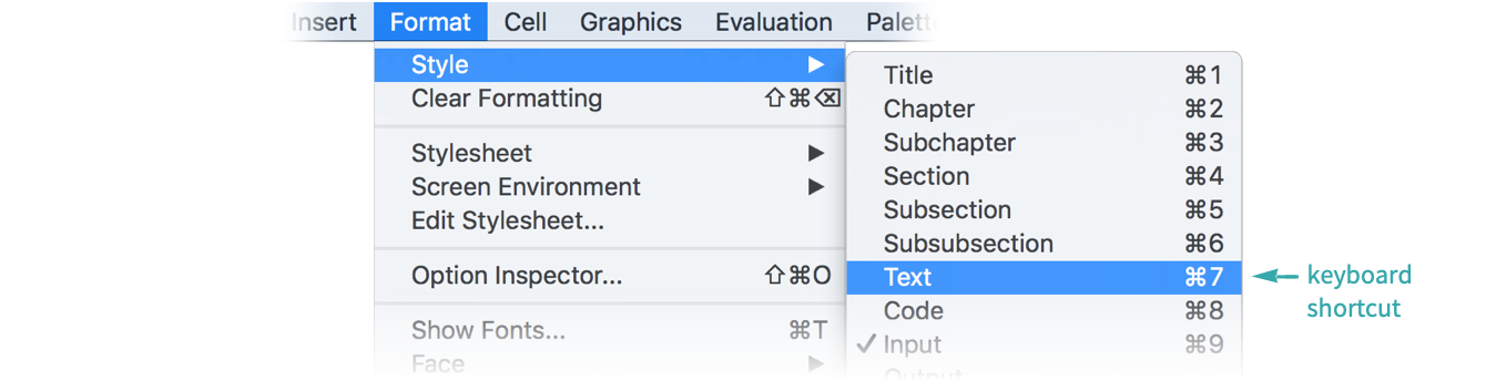 , but can vary depending on the type of notebook. You can find the shortcut in the Text item of the Format ▶ Style menu: