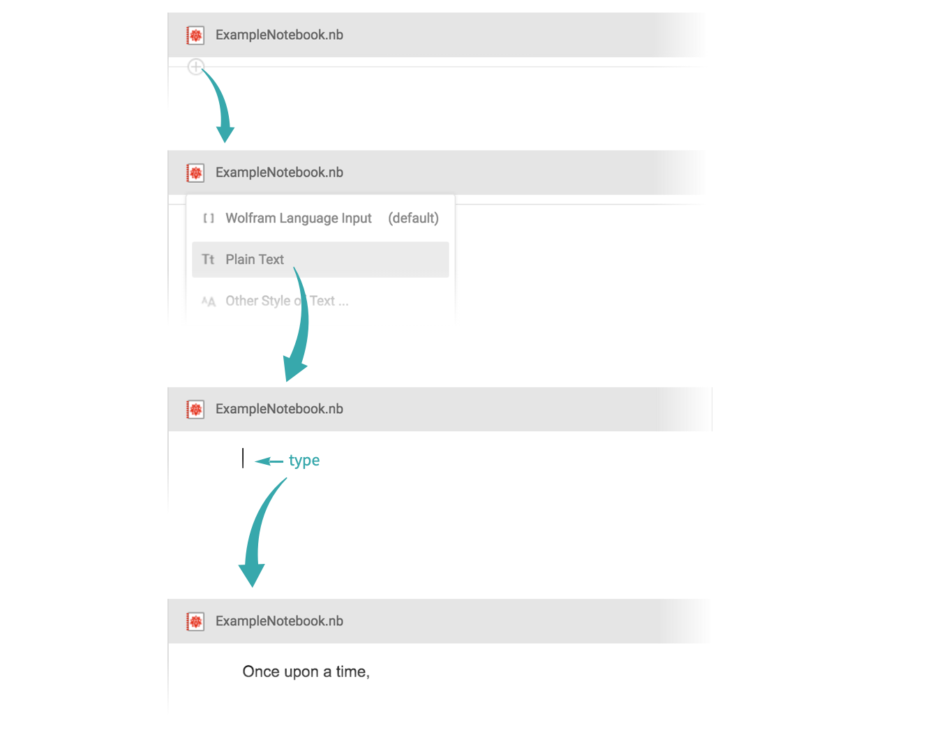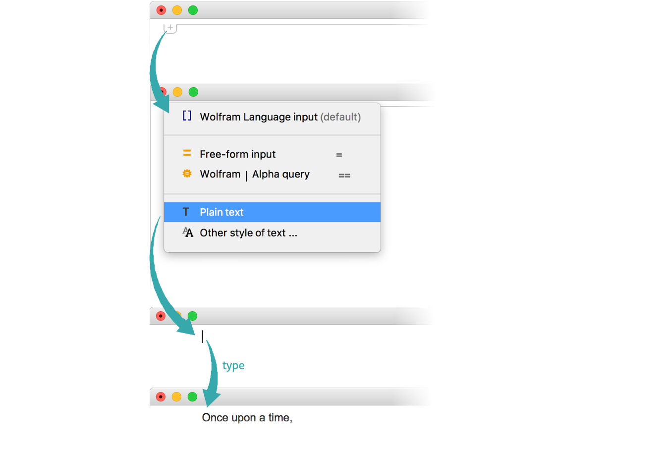 You can mix text and computations in Wolfram Notebooks. Access to a menu of various cell types is provided by the input chooser that appears when the selection is between cells. To insert a text cell, click the input chooser and select Plain Text: