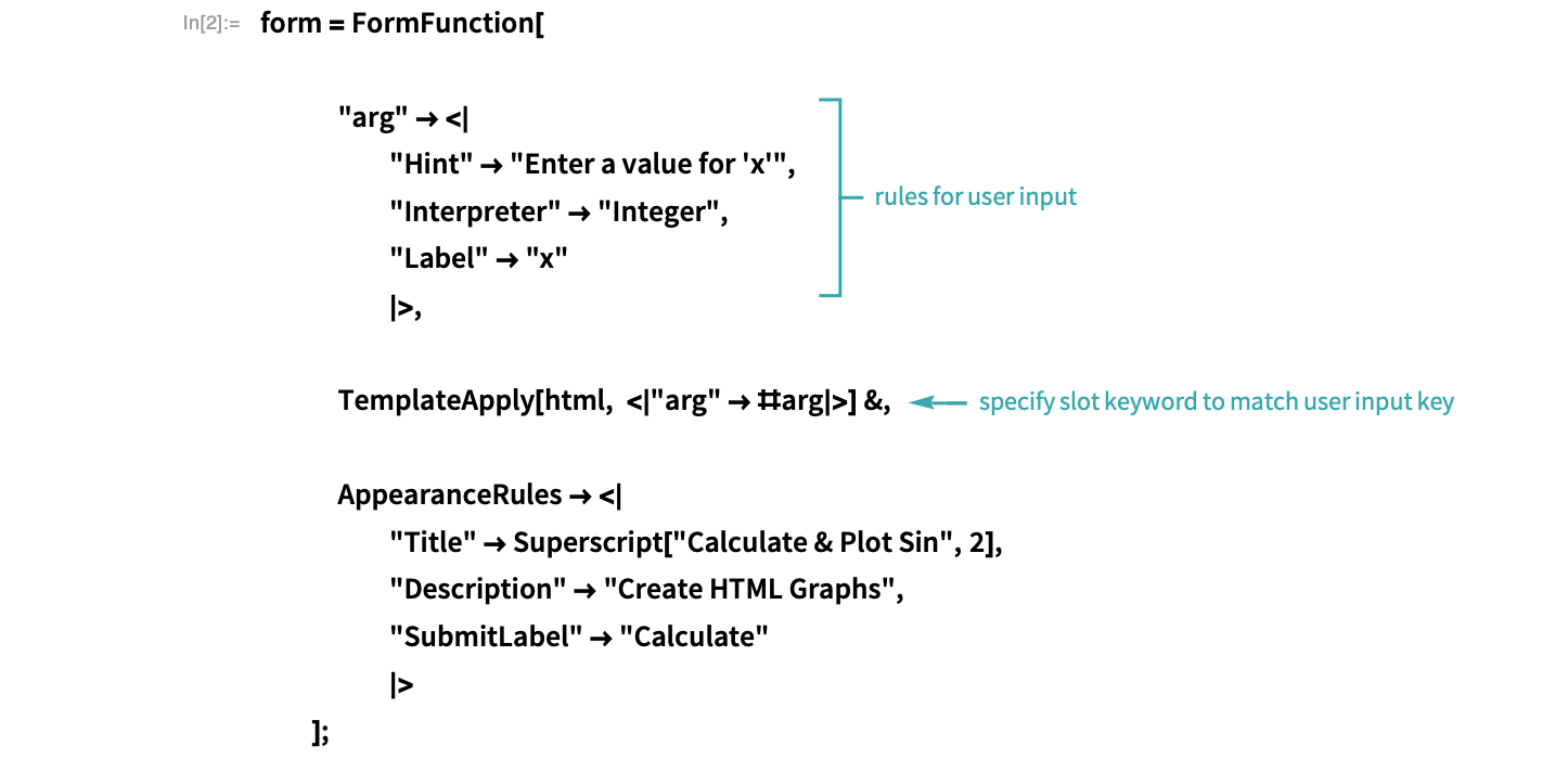 Use FormFunction to create a form that takes user input and injects it into the template with TemplateApply: