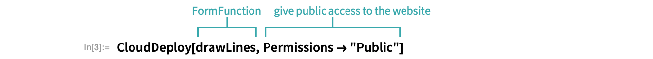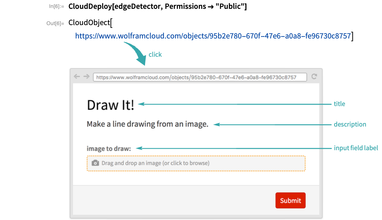 Deploy the FormFunction to the Wolfram Cloud to create an image processing website, specifying Permissions->"Public" to give anyone access to it: