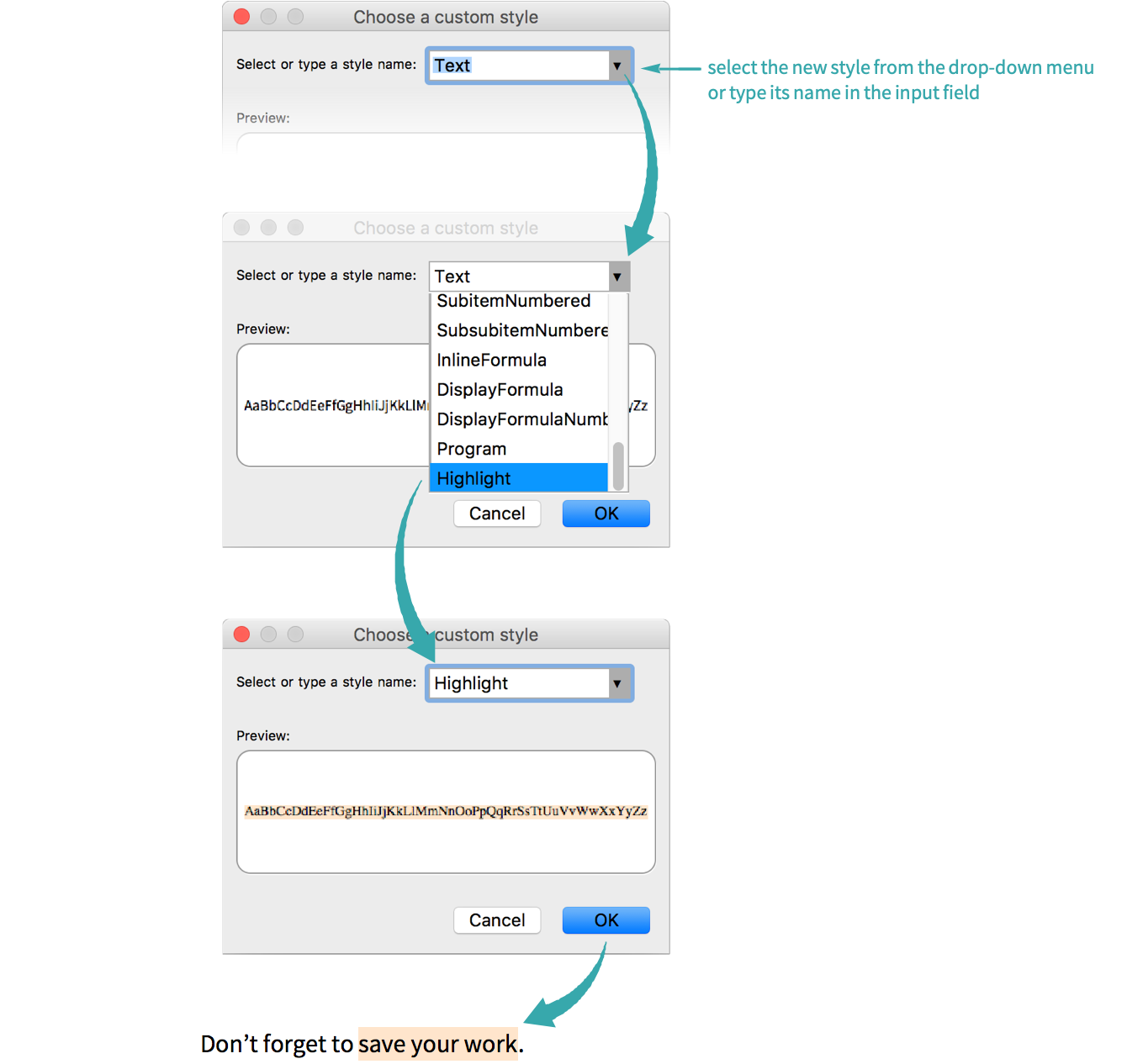 Select the new style from the drop-down menu or type its name in the input field. The new style is applied to the selection: