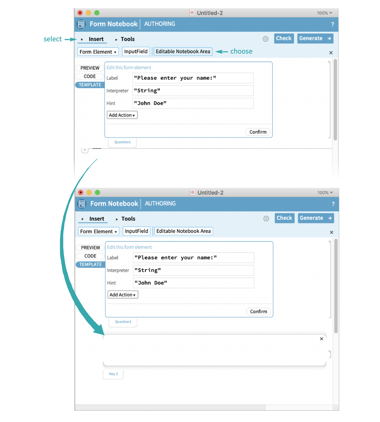 Editable notebook areas let end users execute code in the generated form notebook. Add one to the authoring notebook with Insert ▶ Editable Notebook Area: