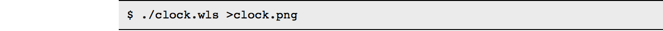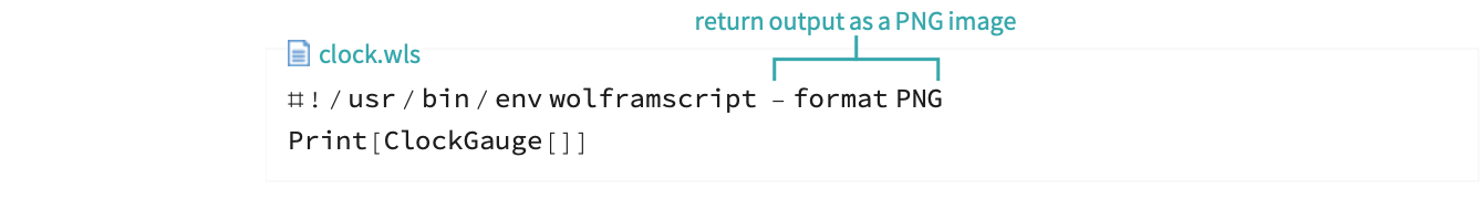 Create a shell script that makes a clock image showing the current time with Wolfram Language code. On Mac and Linux, the first line of the file must start with #!, followed by the path to the WolframScript executable. Specify an image output format with the -format option: