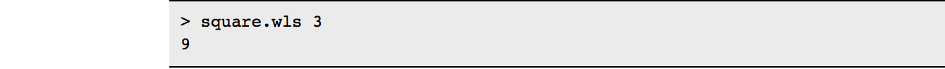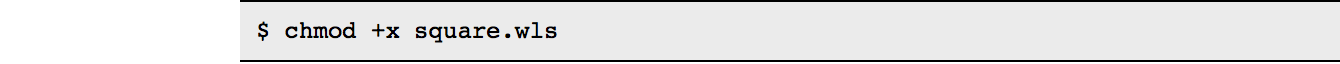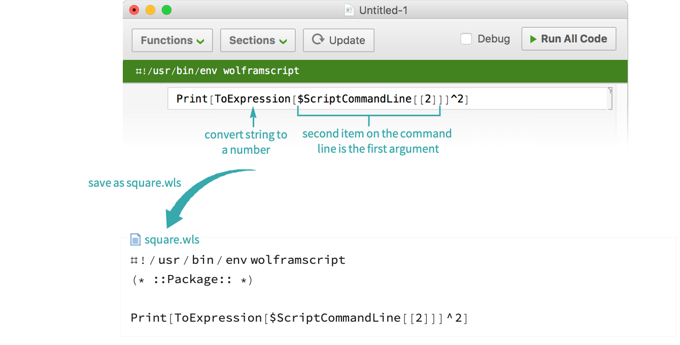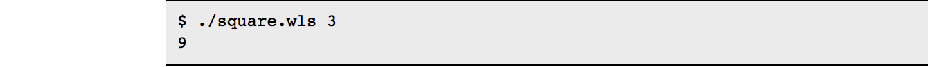 Use File ▶ New ▶ Script, as in the preceding section, to create a shell script that squares a numeric argument with Wolfram Language code. $ScriptCommandLine gives access to script arguments as strings: