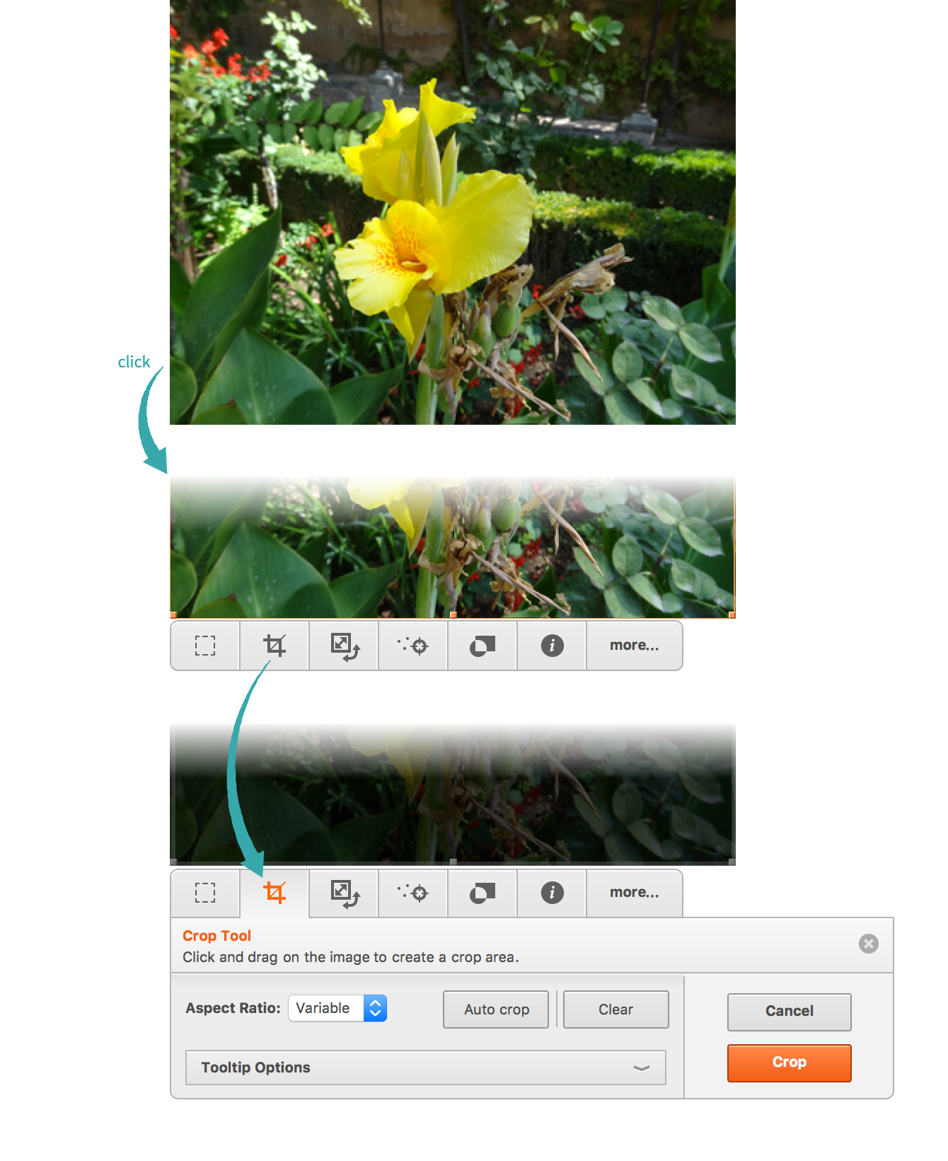 Click an image to expose the image toolbar and select the crop tool: