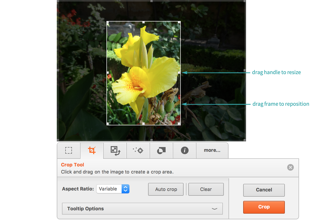 Drag the drag handles or frame to resize or reposition the cropping rectangle: