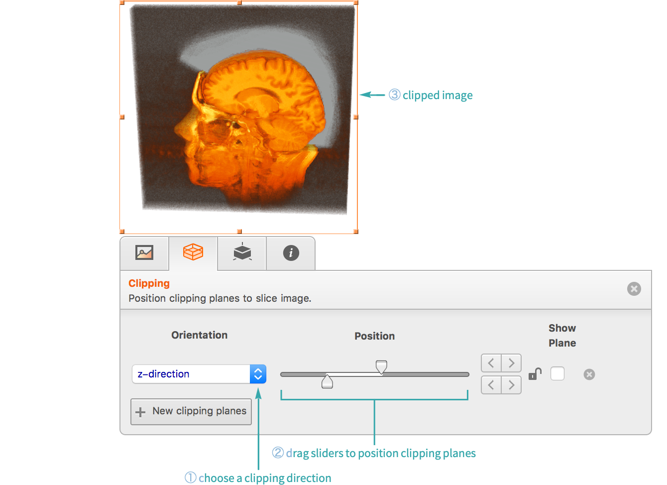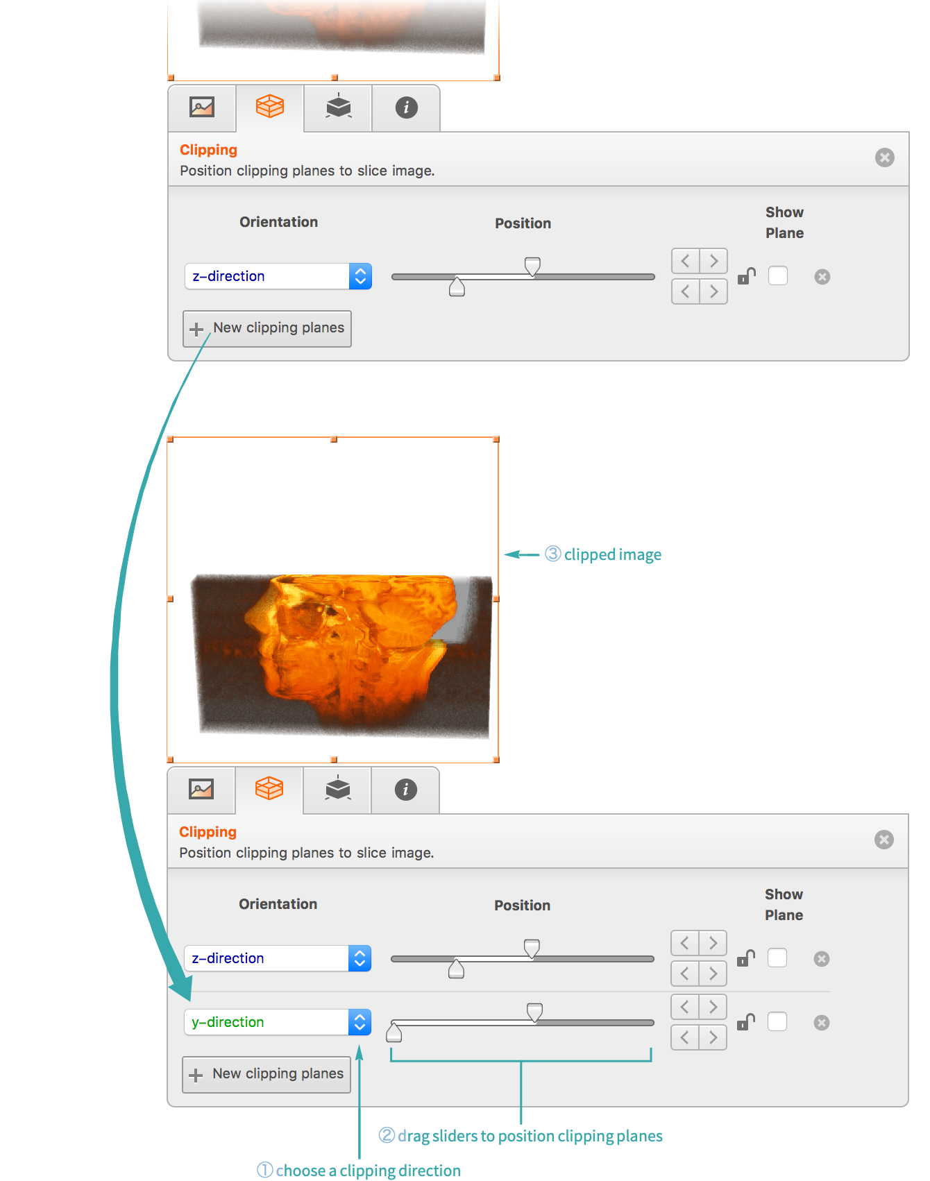 Choose a clipping direction and drag the sliders to position the clipping planes: