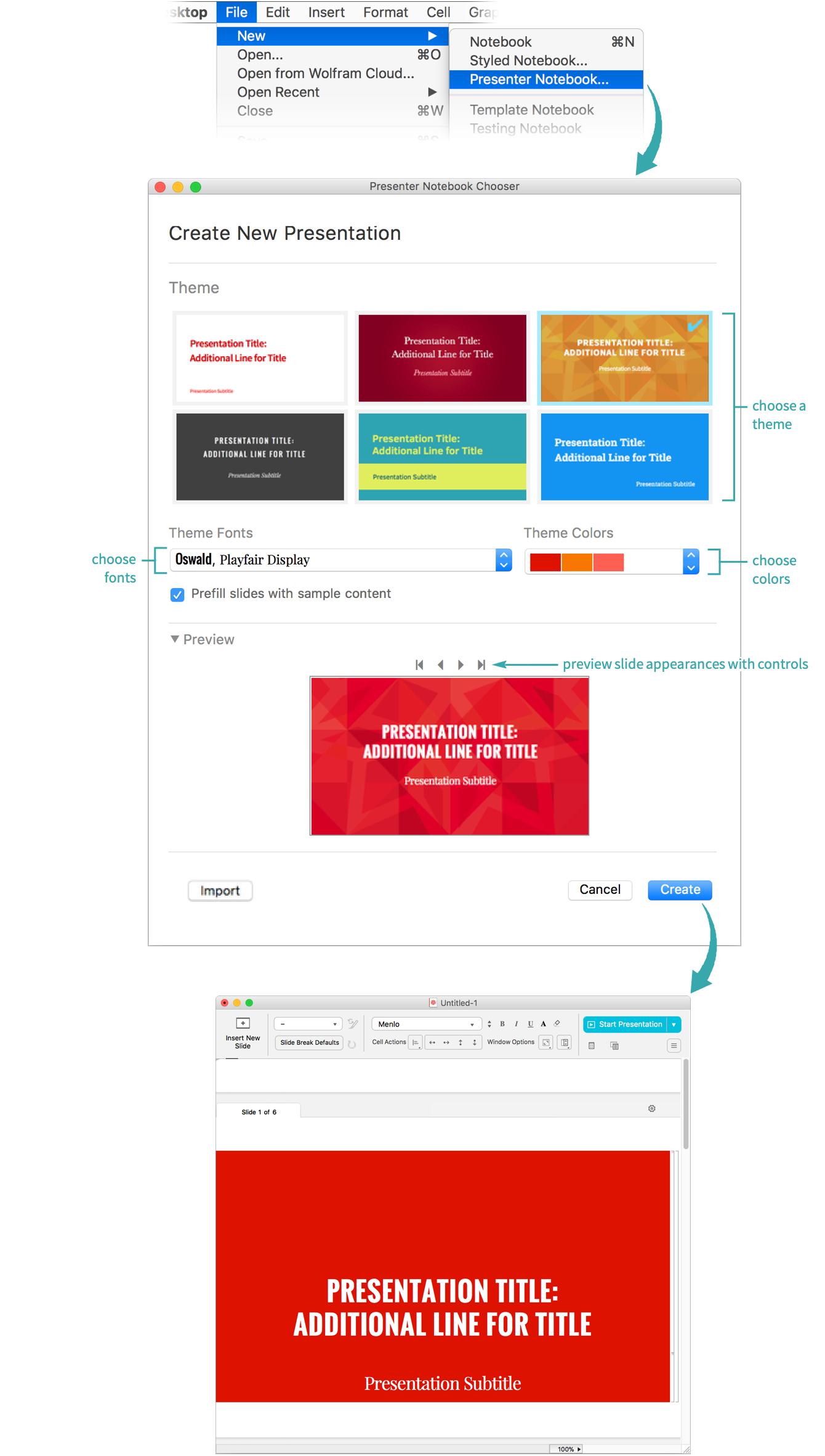 Choose File▶New▶Presenter Notebook... and choose theme, font and color options to customize its appearance. Click Create to create a presenter notebook with the selected options: