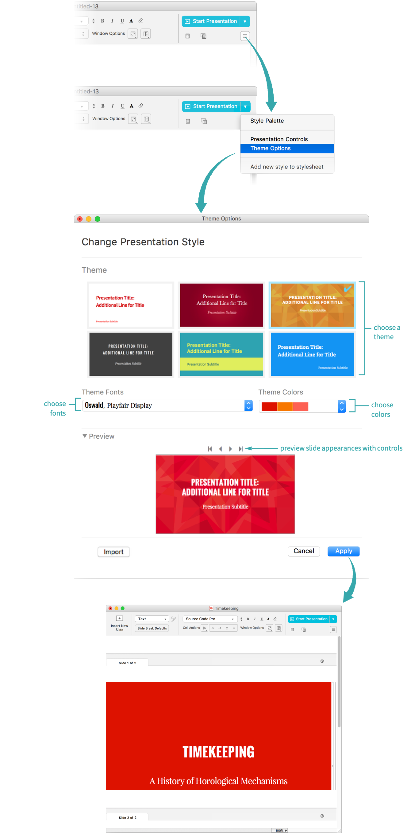 Choose Theme Options from the More... menu () on the right of a presenter notebook toolbar to open the Theme Options dialog. Choose theme, font and color options, then click Apply to apply the styles to the presenter notebook: