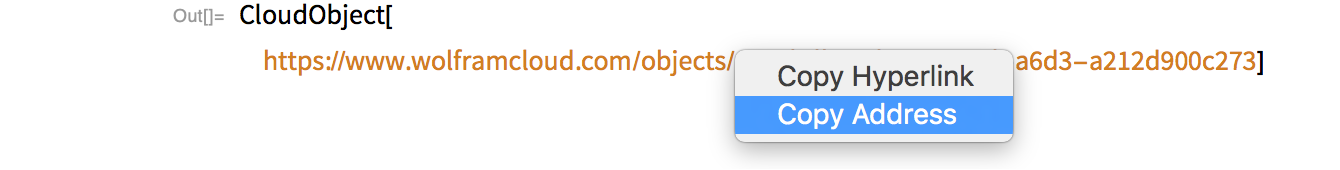 Verify that an API works as you expect it to by calling it from a browser. To construct a URL that calls the API, right-click the URL in the CloudObject output of CloudDeploy and choose Copy Address: