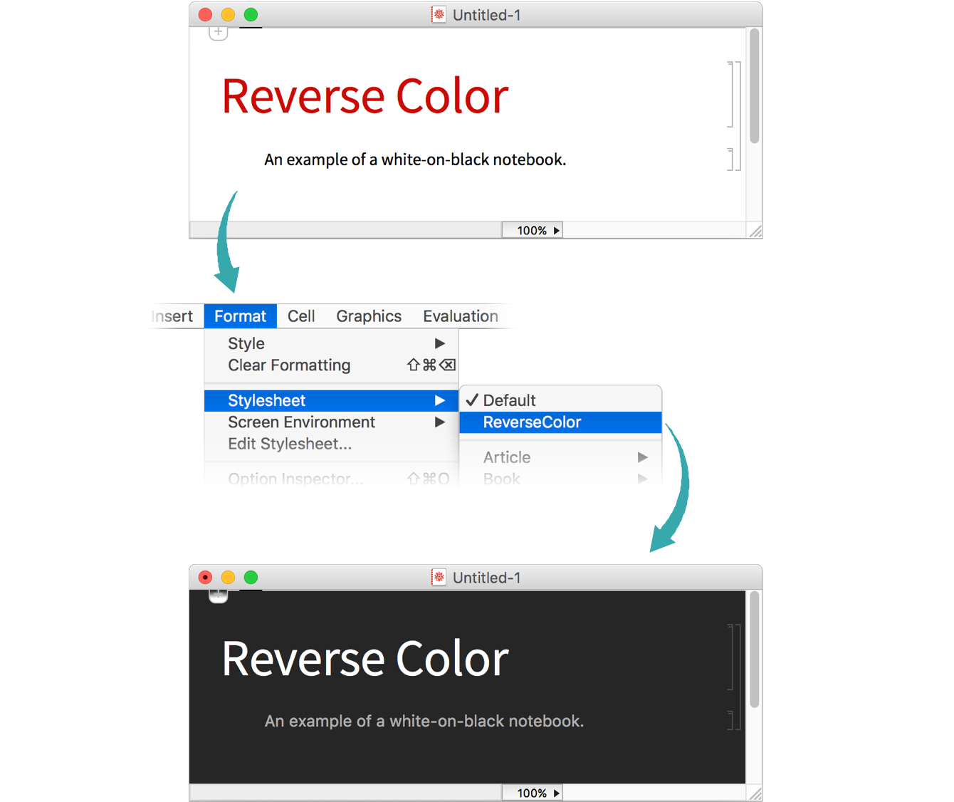 Choose Format ▶ Stylesheet ▶ ReverseColor to make the current notebook white on black: