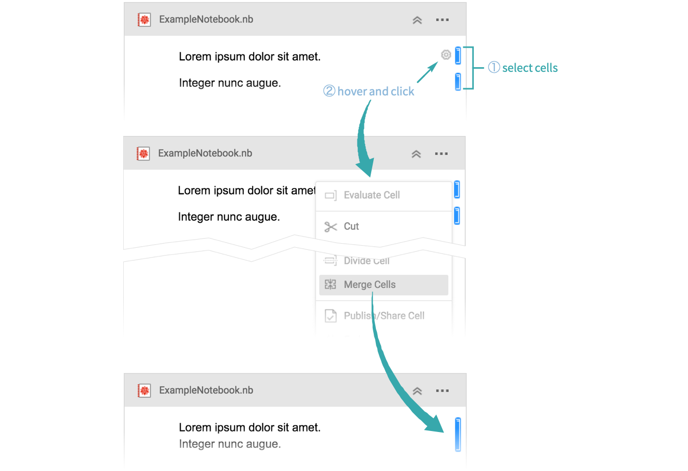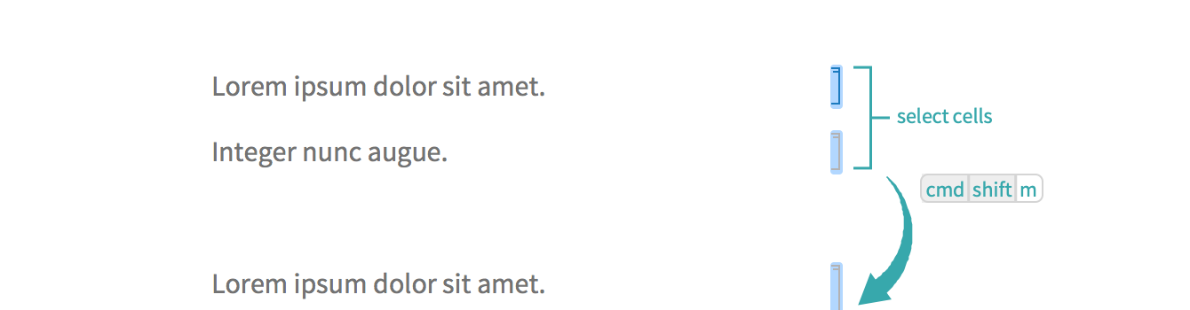 To merge one or more cells, select the cells, hover near the cell bracket, click the cell menu icon, and choose Merge Cells: