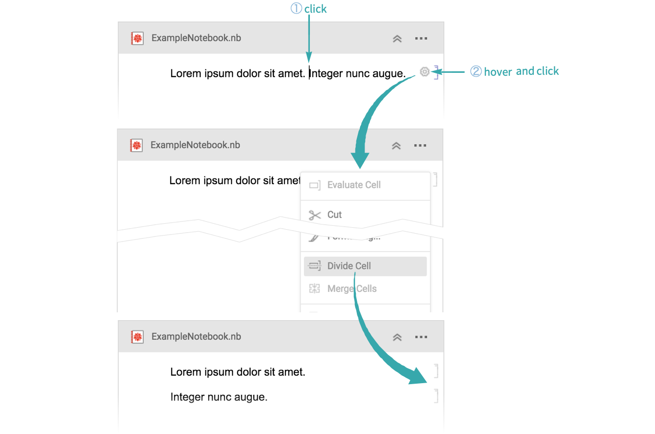 To divide a cell, click where you want to divide, hover near the cell bracket, click the cell menu icon, and choose Divide Cell:
