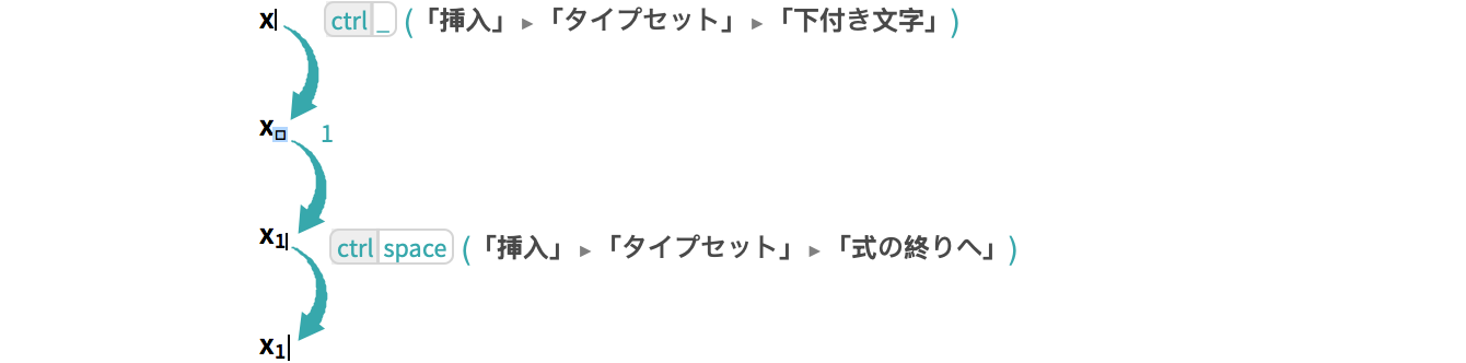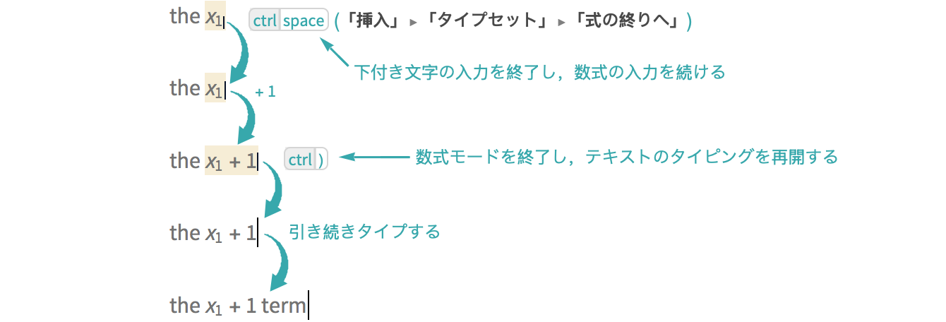 (「挿入」 ▶ 「タイプセット」 ▶ 「式の終りへ」)を使って,下付き文字の入力を終了する: