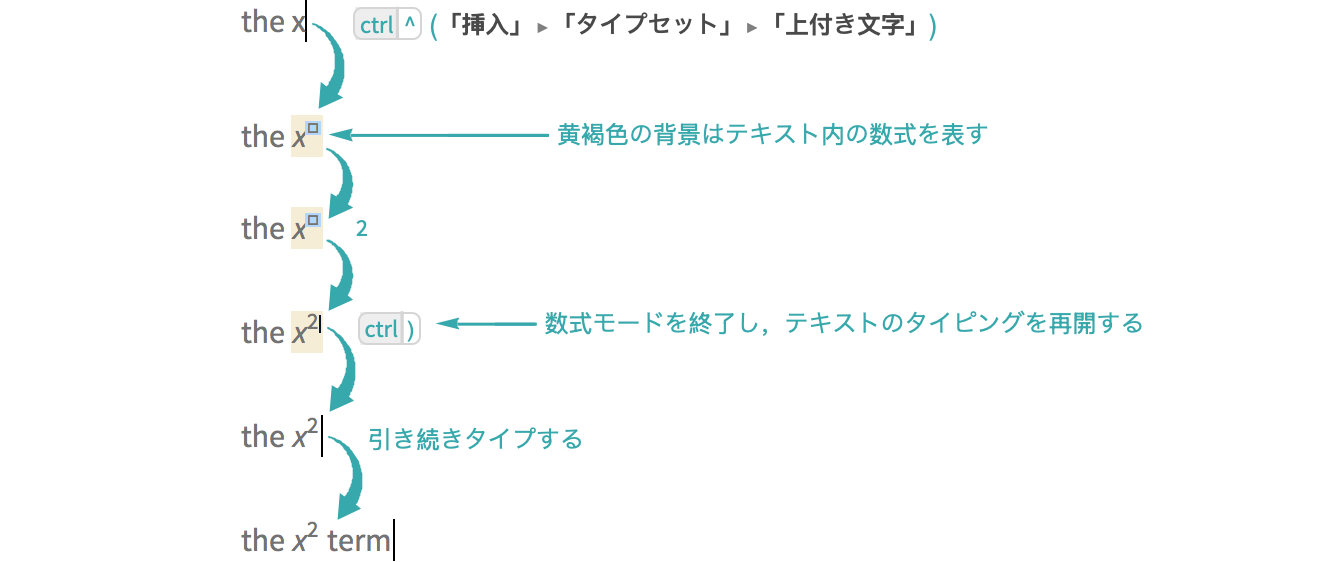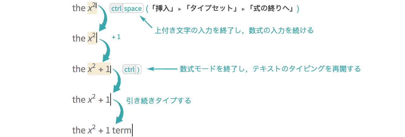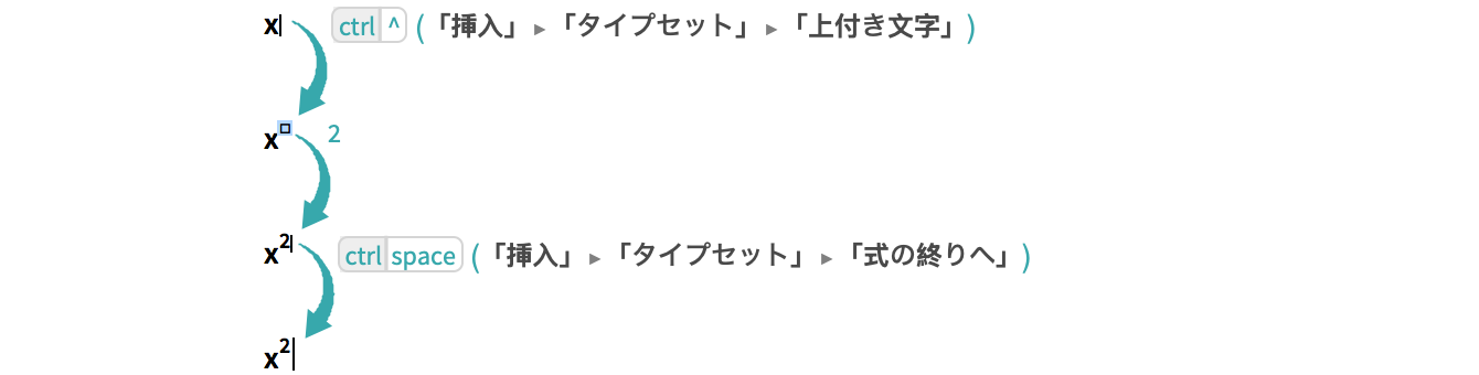 (「挿入」 ▶ 「タイプセット」 ▶ 「式の終りへ」)を使って,上付き文字の入力を終了する: