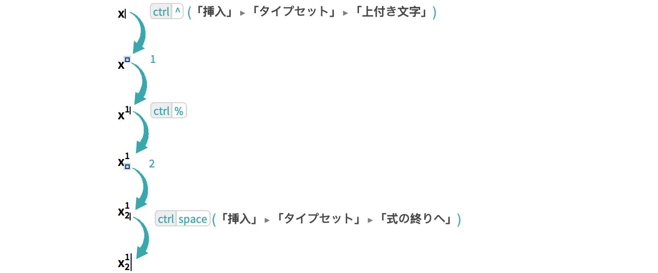 直接キーボードから,あるいはメニューコマンドを使って,下付き文字や上付き文字を入力する.