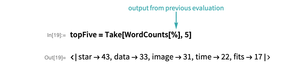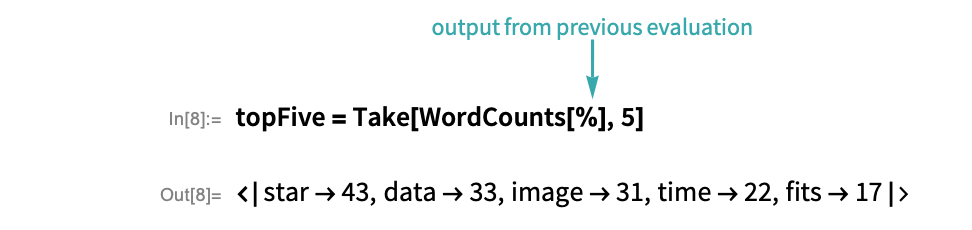 Use WordCounts to count the number of times a word appears in the string, and take the top five most frequently used words: