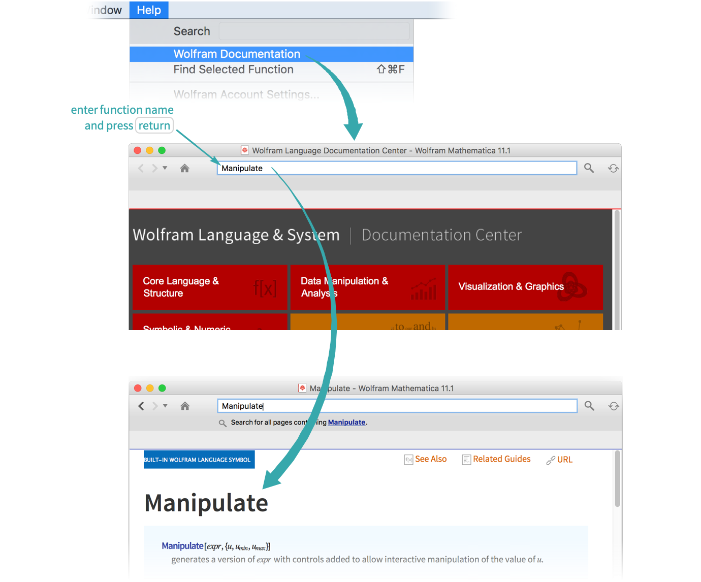 Choose Help▶Wolfram Documentation or type , enter the function name in the search field and press :