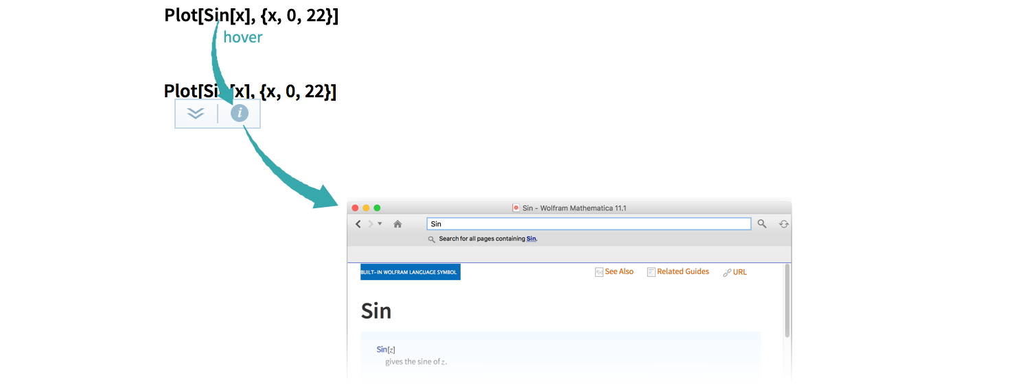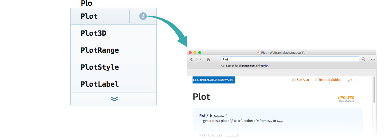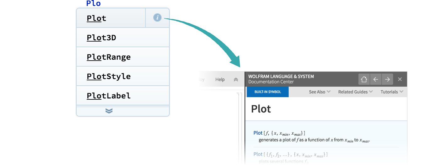 When you start typing the name of a function, a popup menu shows possible completions. Hover over a function name and click the information icon () to get help on that function in the sidebar: