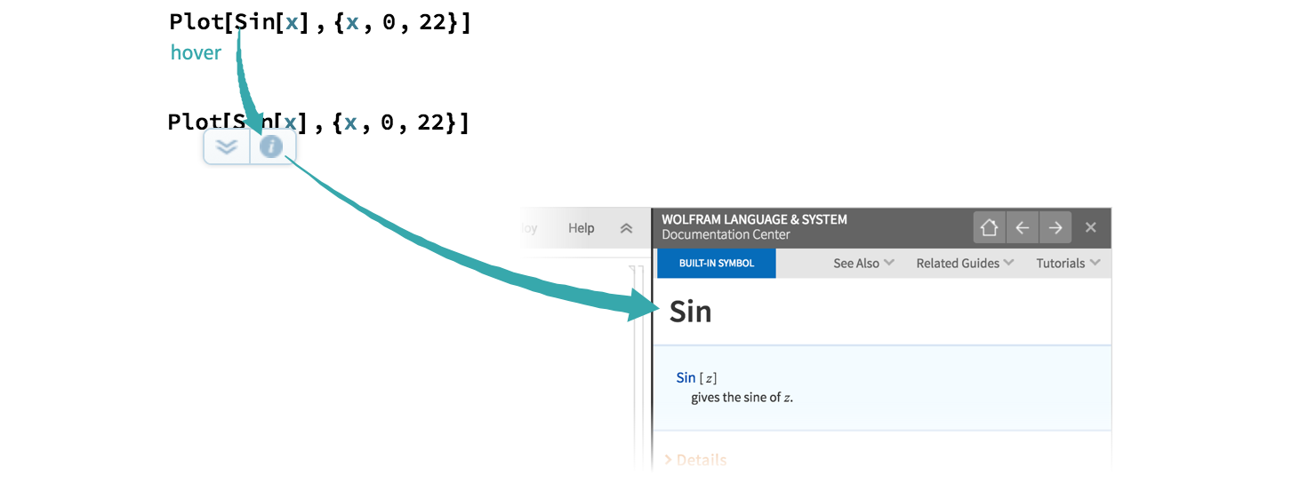 To get help on any function that appears in code, hover over the function name and click the information icon in the popup menu. Help appears in the sidebar:
