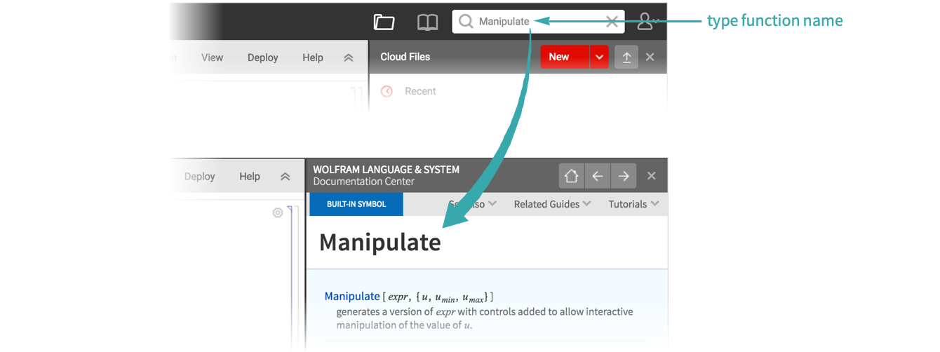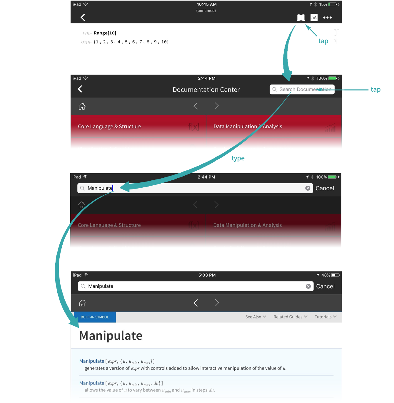 Tap the documentation icon to open the Documentation Center and enter the function name in the search field: