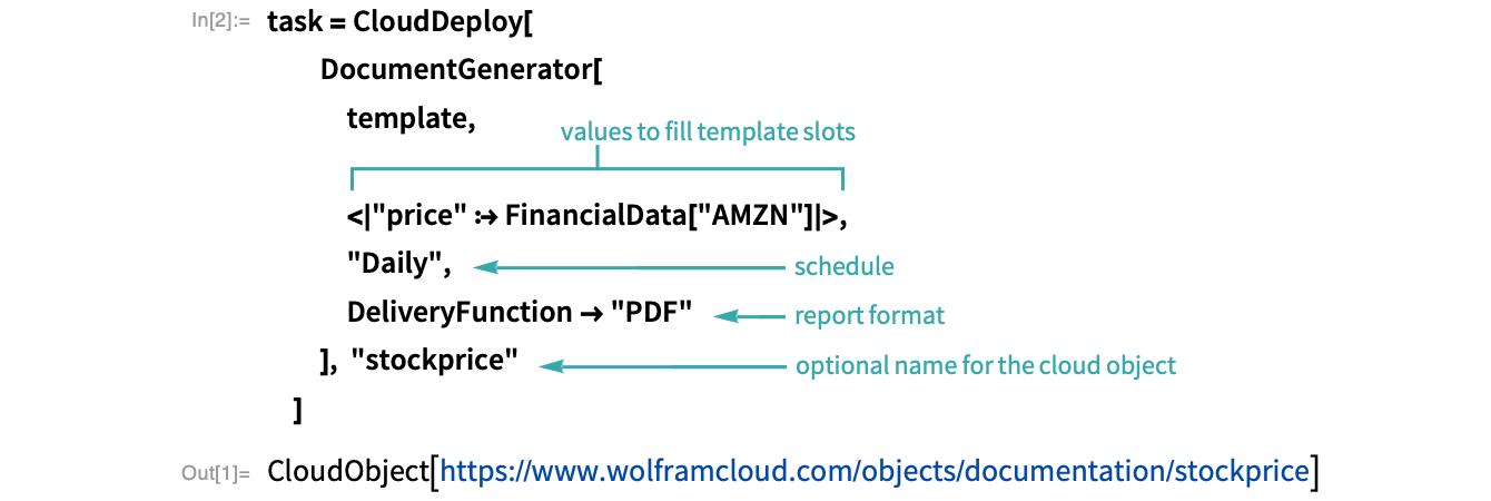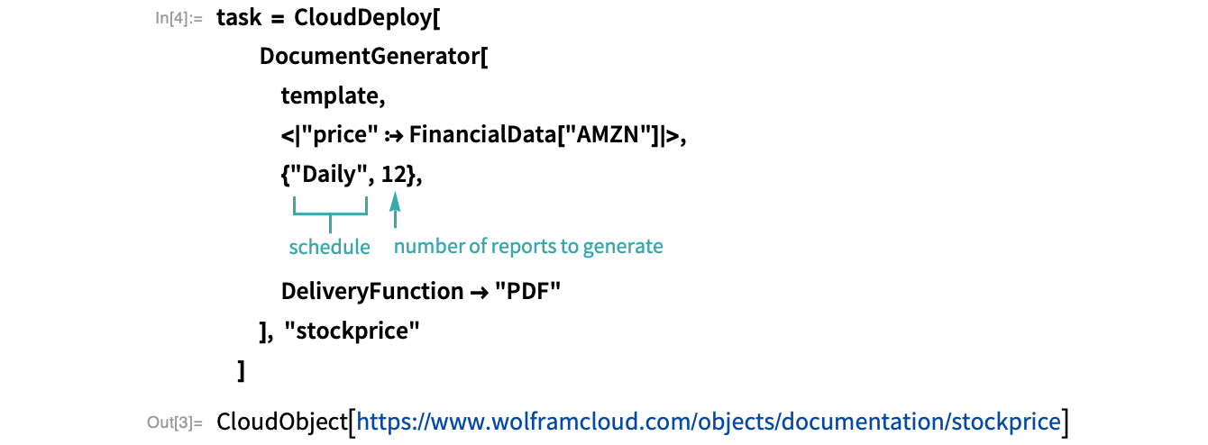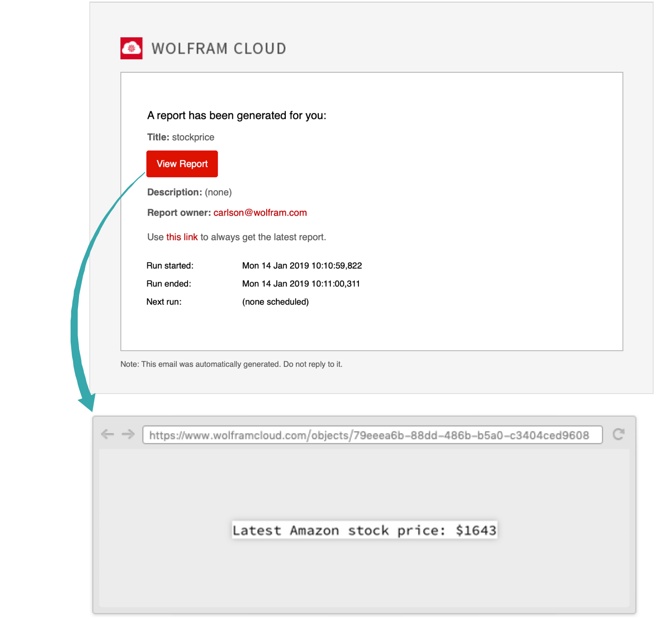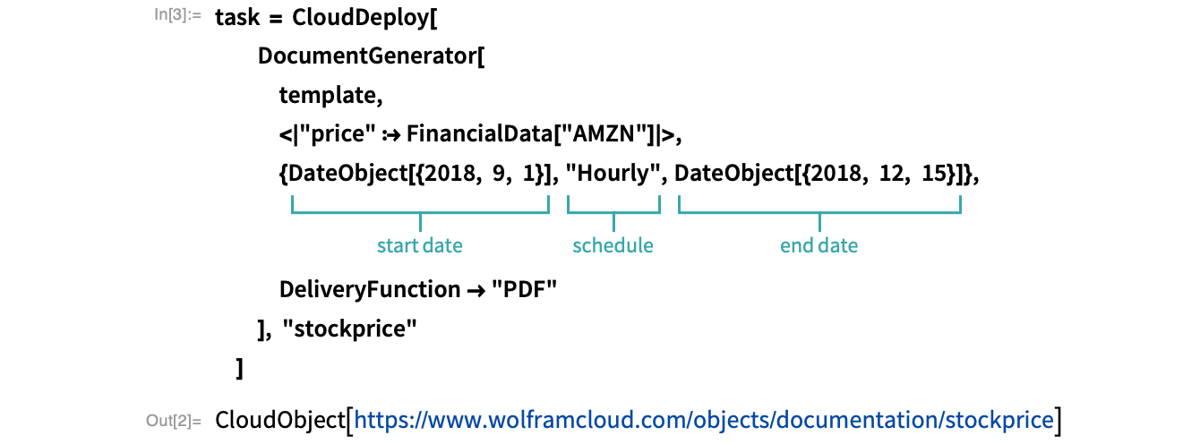 Deploy a report generator to the cloud that uses the template to generate hourly stock price reports: