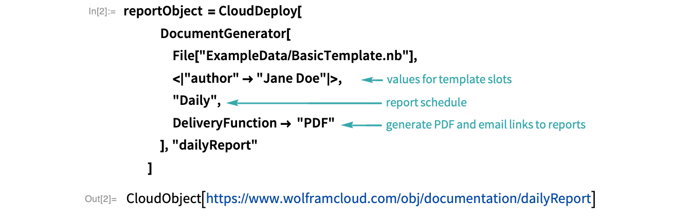 Deploy to the cloud a document generator that uses the notebook template. Specify DeliveryFunction"PDF" to email links to generated PDF reports to your $WolframID: