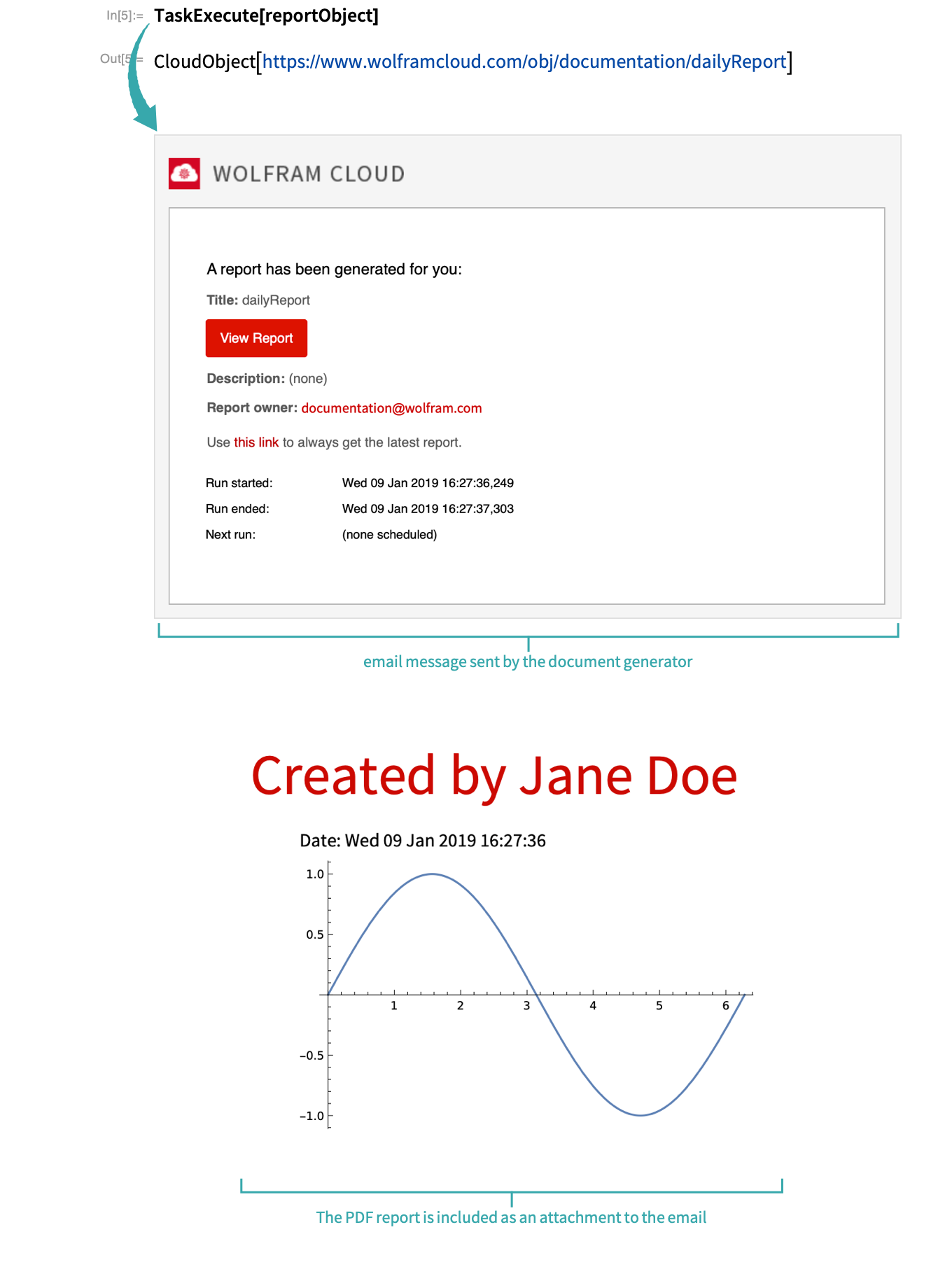 The document generator will automatically mail a report according to the schedule you specified. To manually trigger the generation once, use TaskExecute: