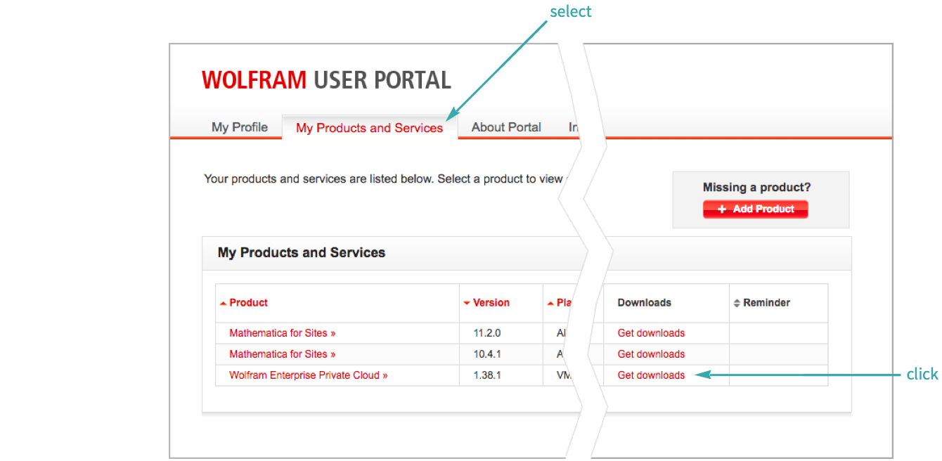 Select My Products and Services and click “Get downloads” for Wolfram Enterprise Private Cloud (EPC):