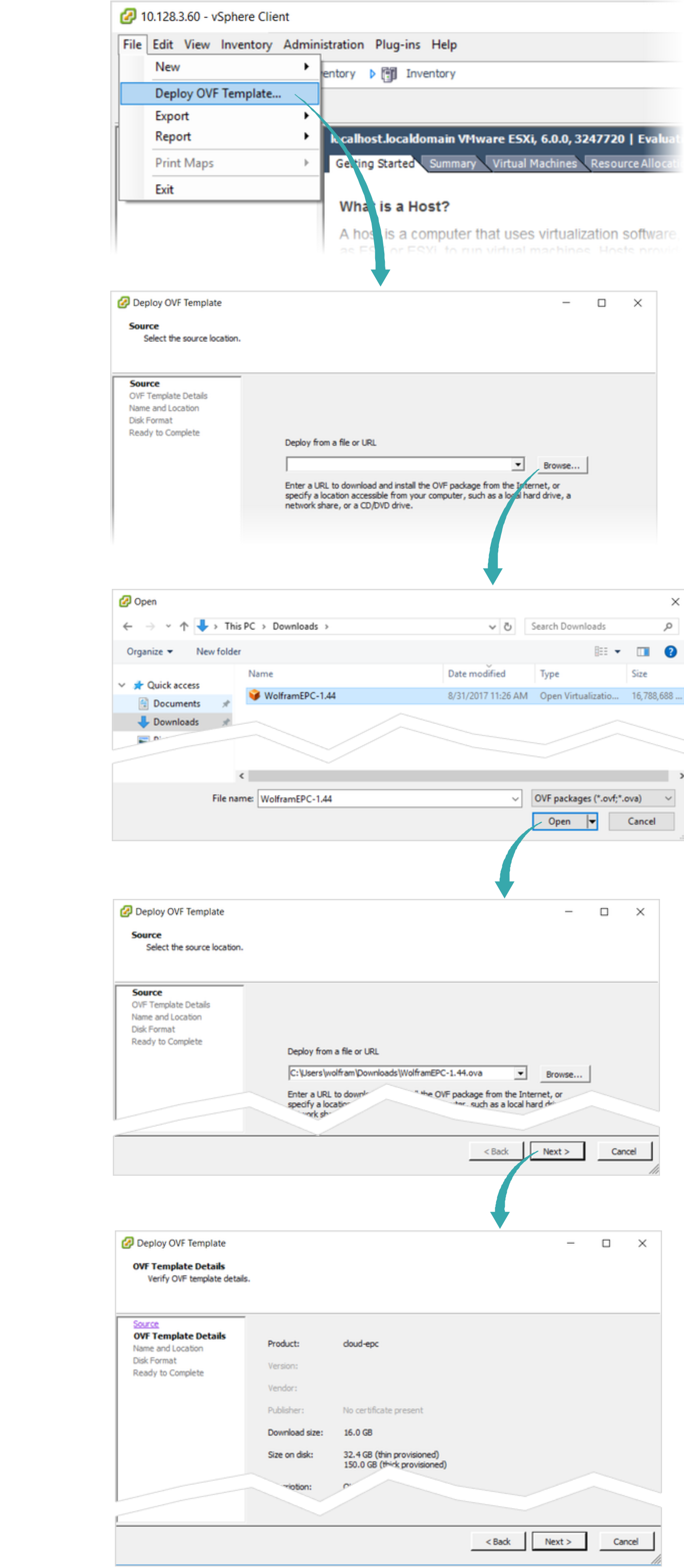 Select File ▶ Deploy OVF Template and locate the OVA containing the EPC virtual machine (most likely in your Downloads folder):