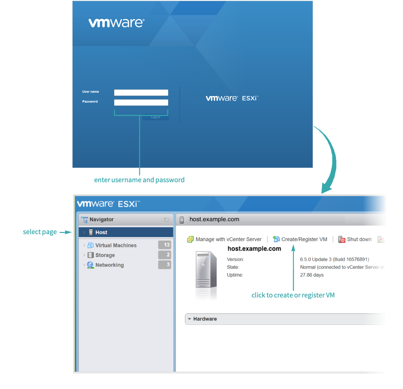 From your browser, go to the target host name or IP address where the VMware ESXi Client lives and log on and navigate to the “Host” page to register or create a virtual machine: