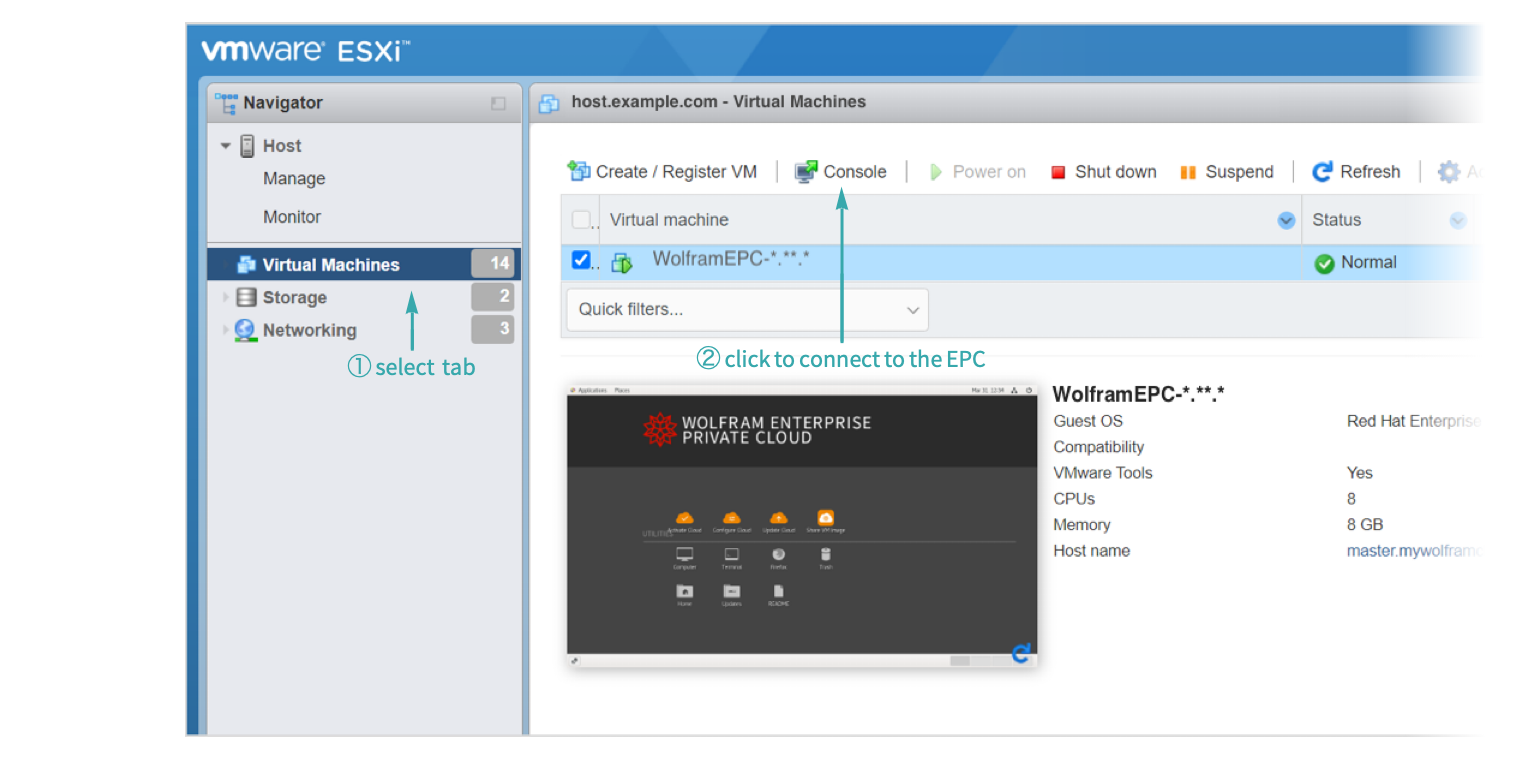 In the main window, click the plus sign (+) to the left of the host icon, then right-click Wolfram EPC and choose Power ▶ Power On:
