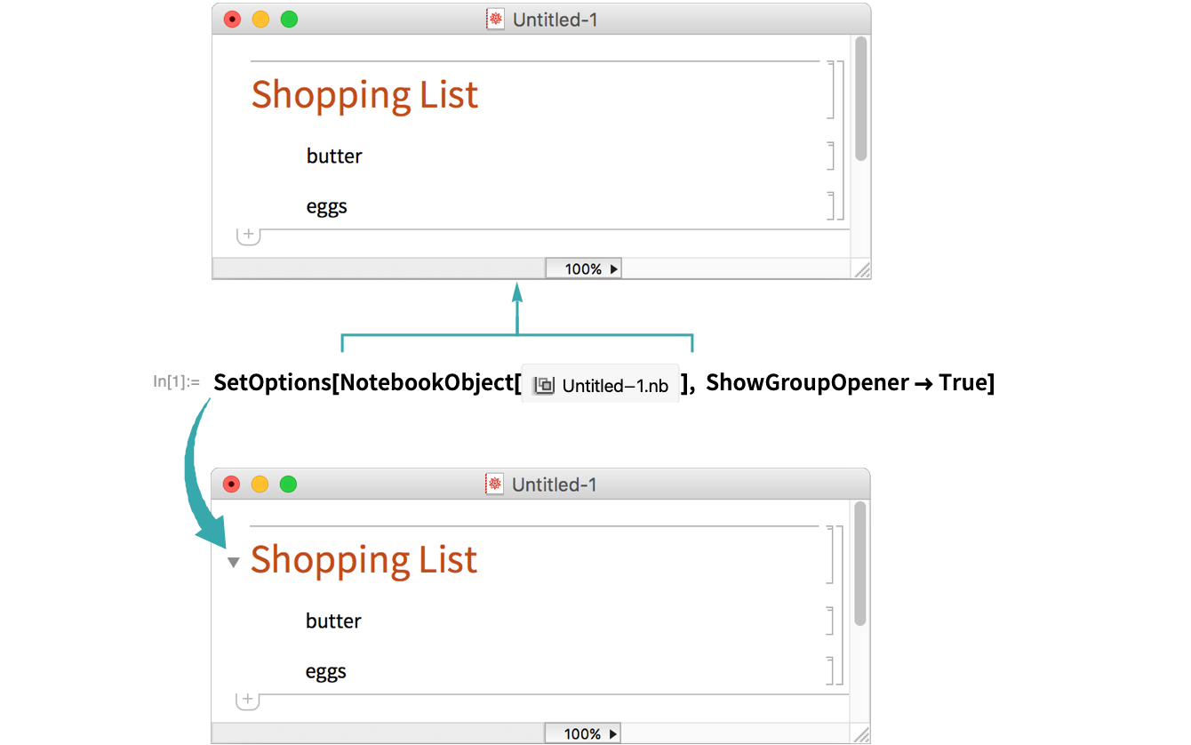 To make groups in a notebook easier to open, add opener controls with the ShowGroupOpener option: