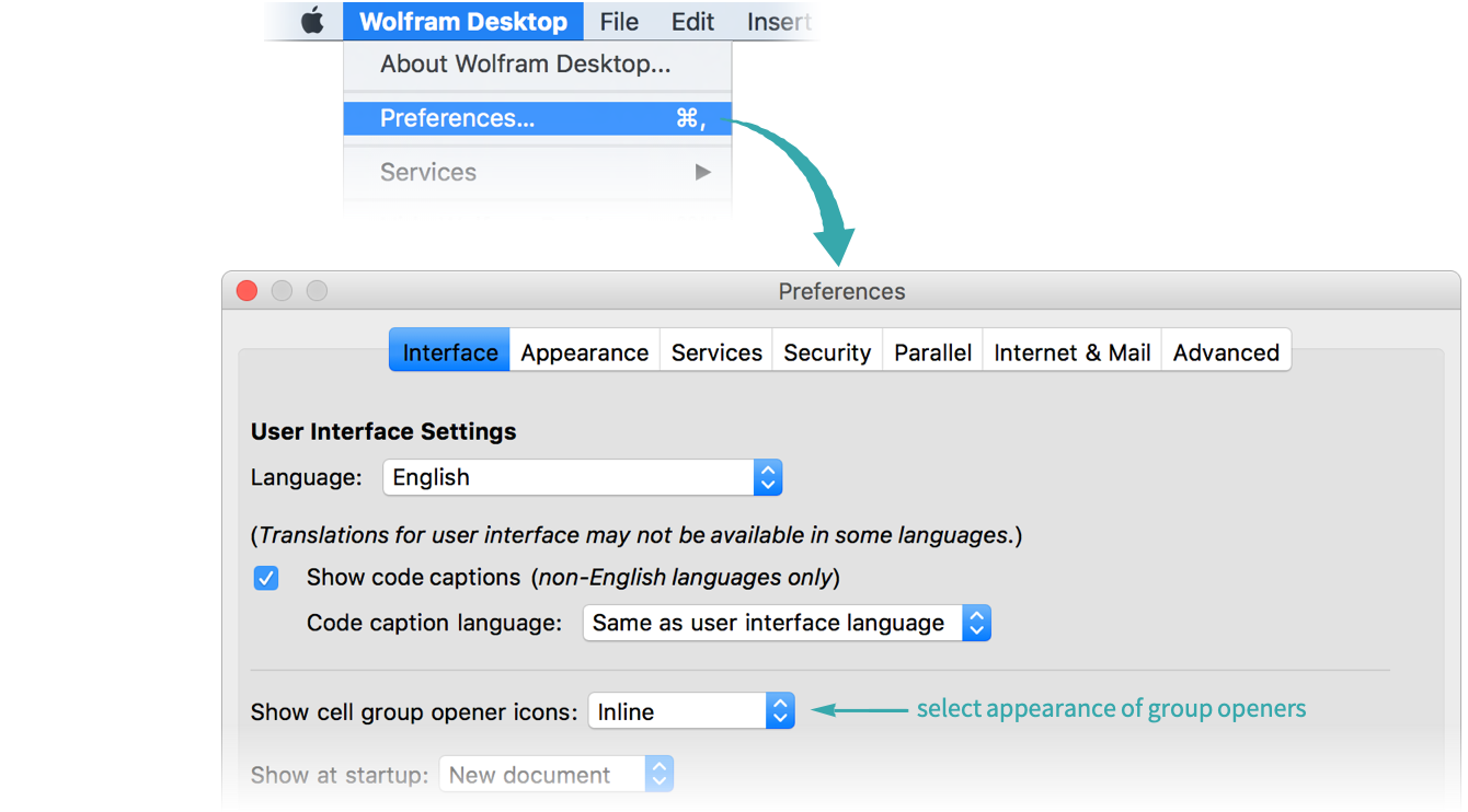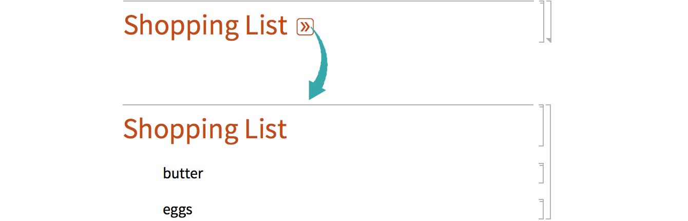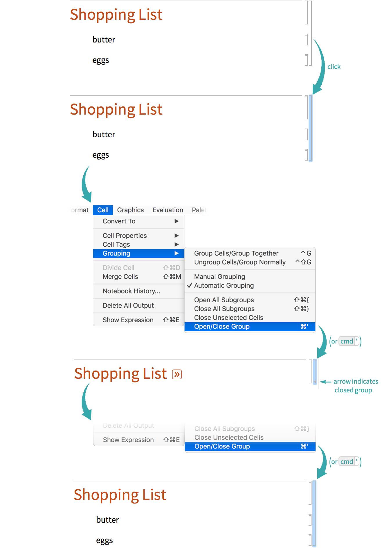 Click a cell group’s bracket to select it and choose Cell ▶ Grouping ▶ Open/Close Group (