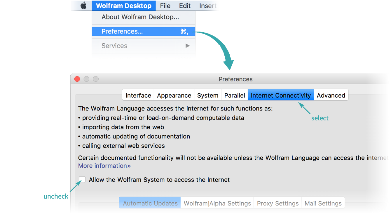 , select the Internet Connectivity tab and uncheck “Allow the Wolfram System to access the internet”: