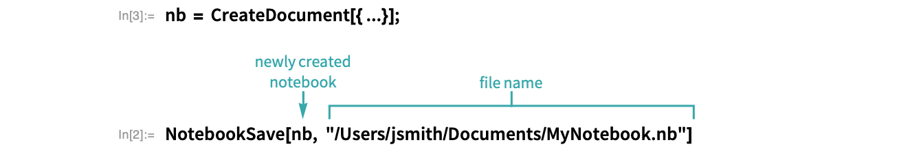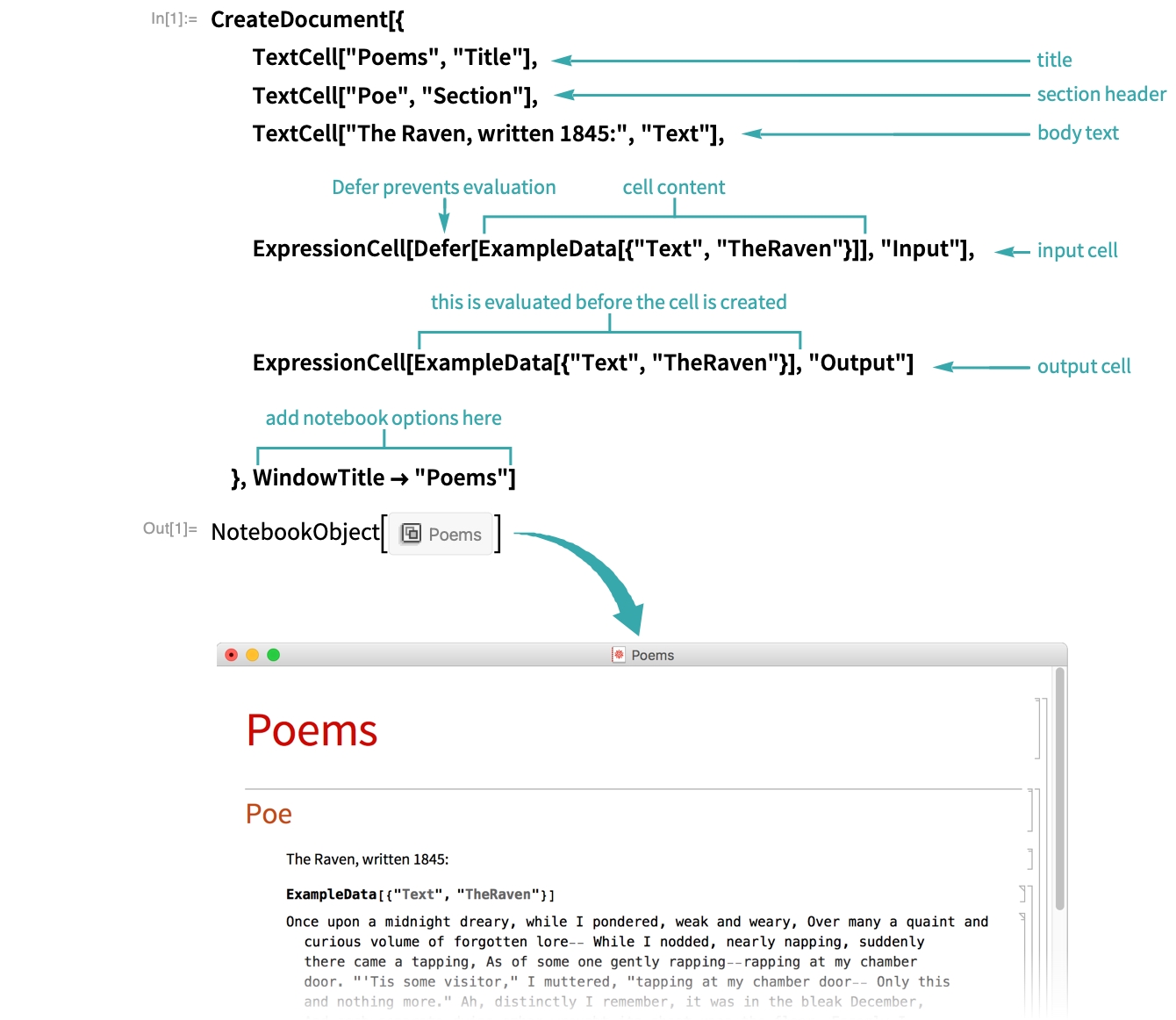 Create a notebook with CreateDocument. Include textual cells with TextCell and input and output cells with ExpressionCell: