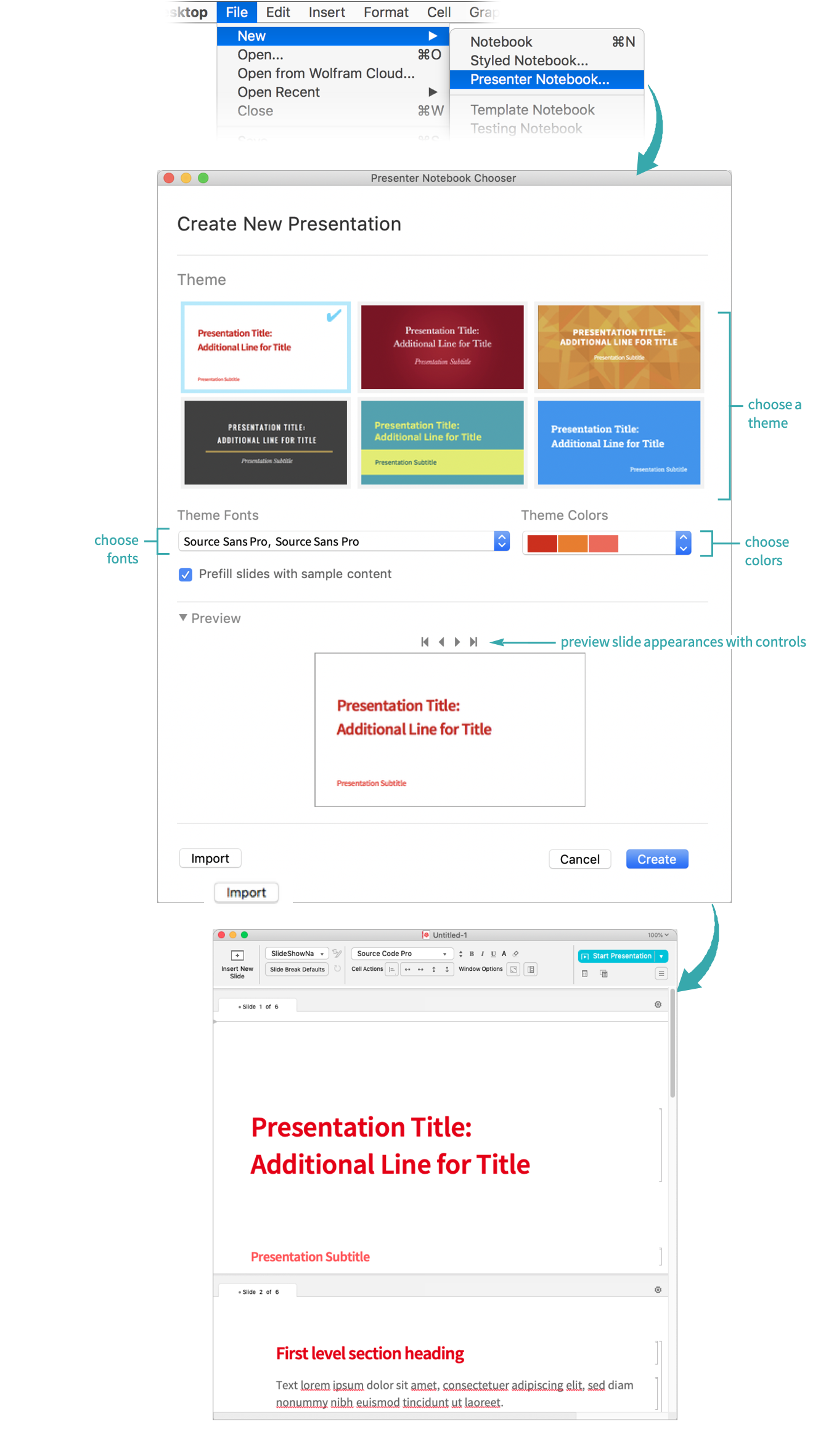 Choose File ▶ New ▶ Presenter Notebook... and choose the theme, font and color options. Click Create to create a presenter notebook with the selected options: