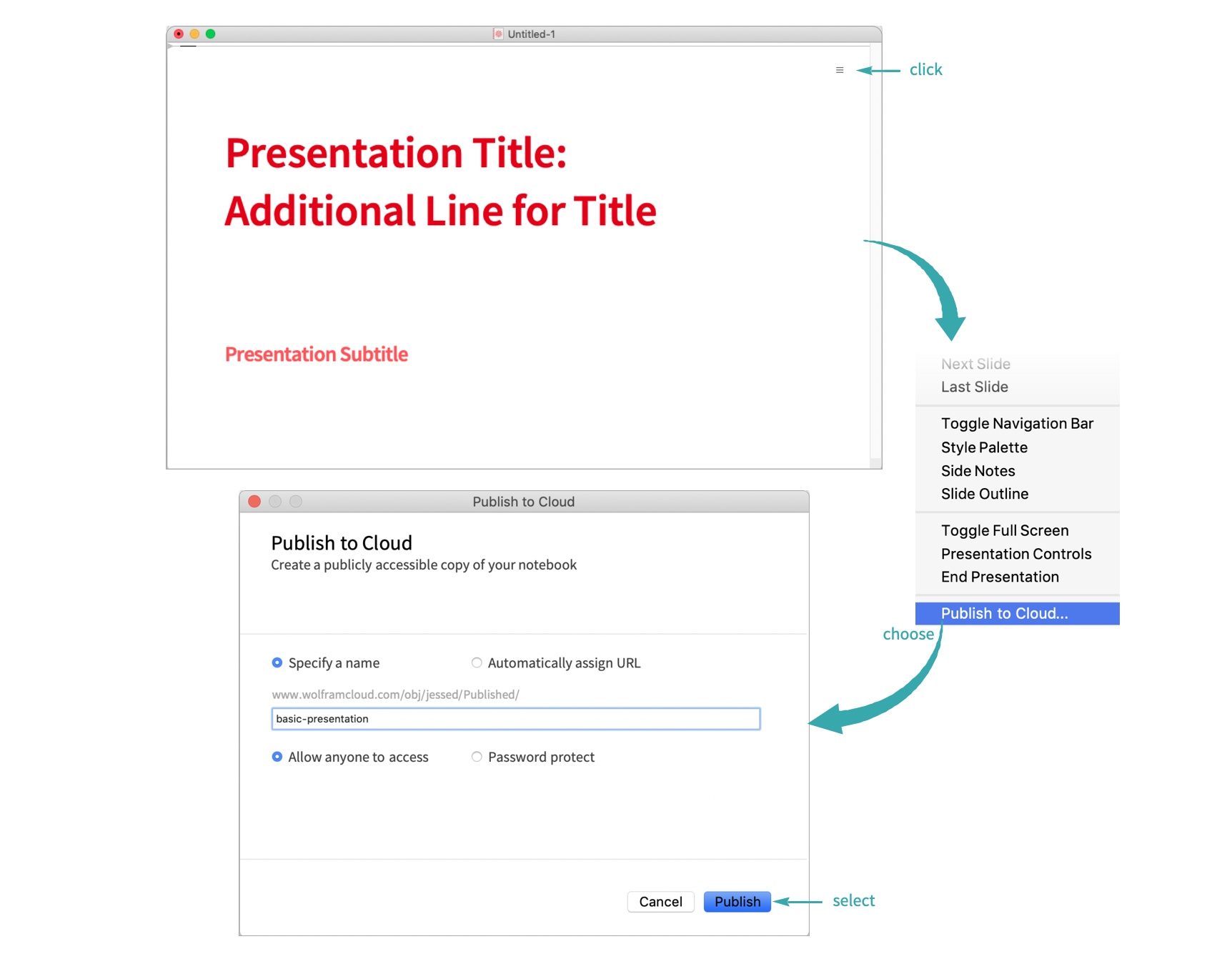 Publish a finished slide show notebook to the Wolfram Cloud that can be viewed by and presented to anyone.