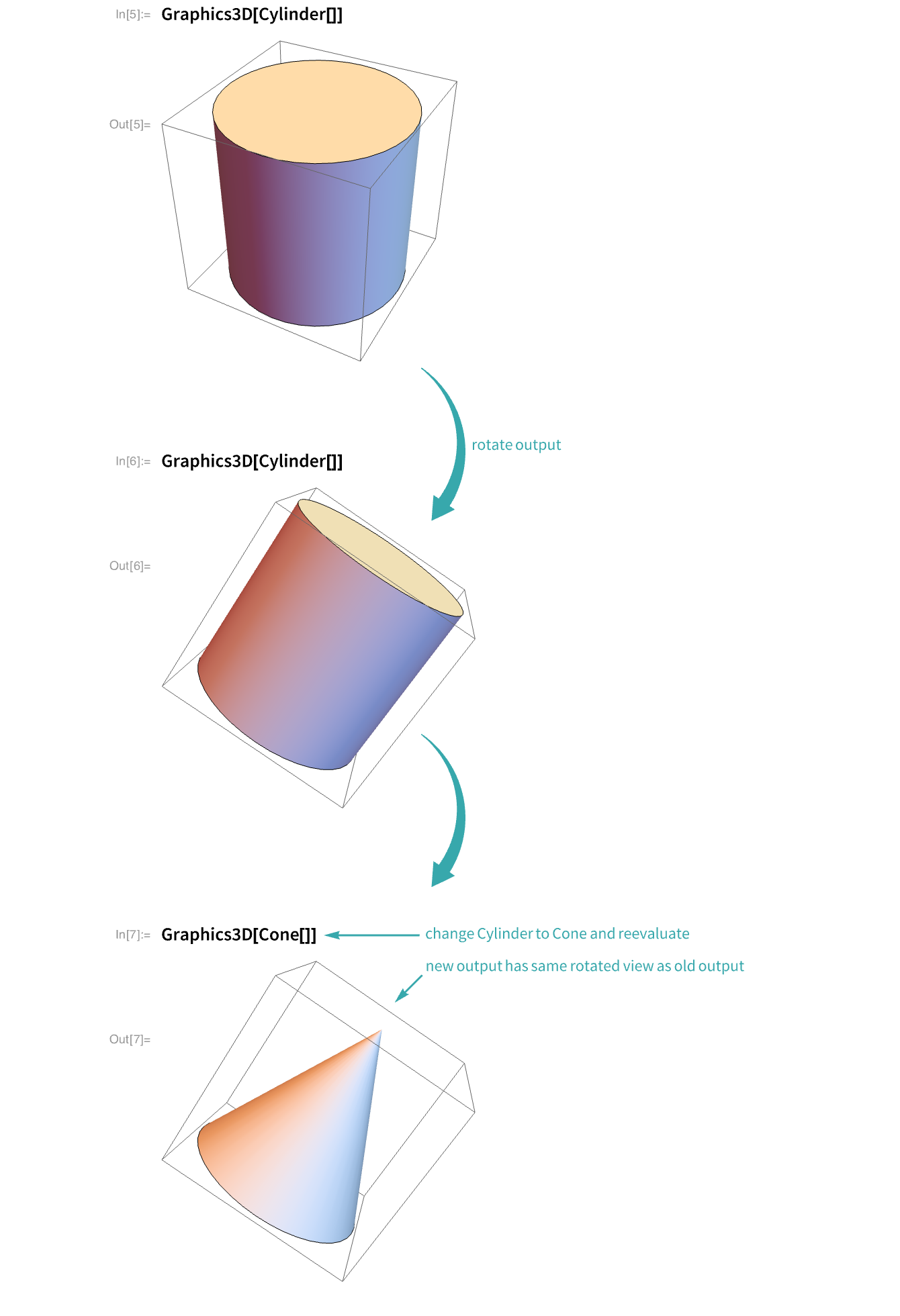 If you change the view of a Graphics3D output and then edit and reevaluate the input, the new output assumes the view of the old output: