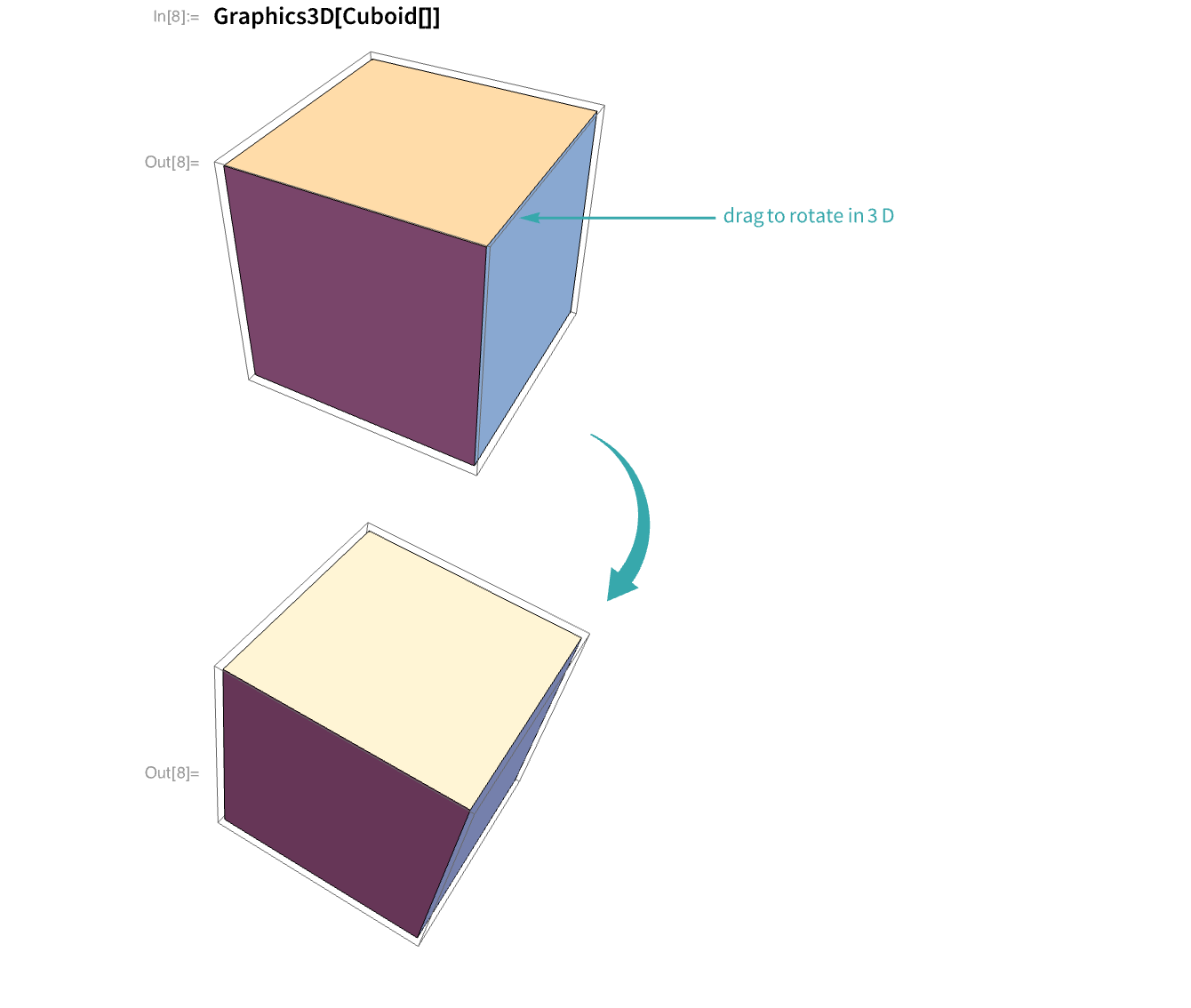 Mouse down near the center of a 3D graphic and drag to rotate it in 3D. The