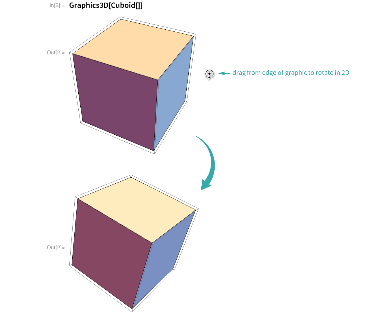 Mouse down near the edge of a 3D graphic and drag to rotate it in the plane of the screen. The